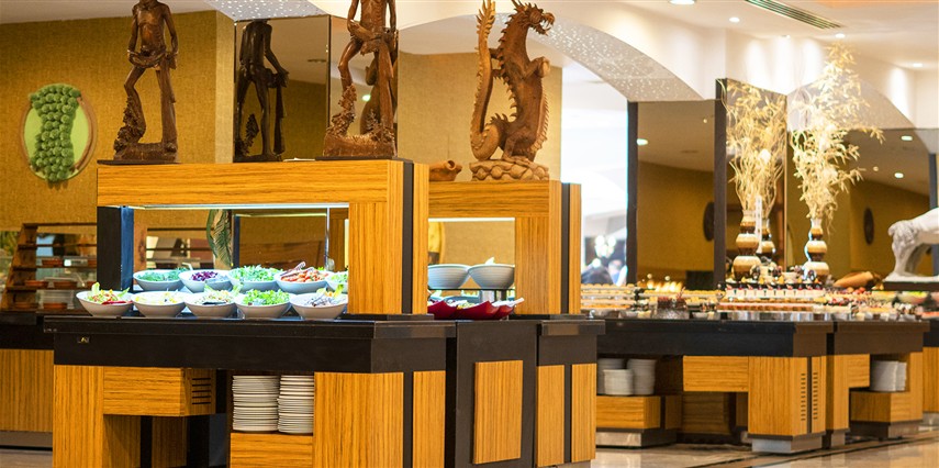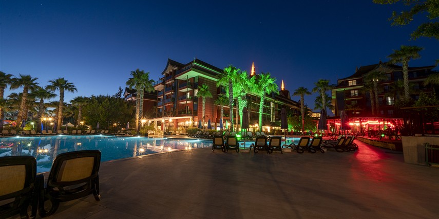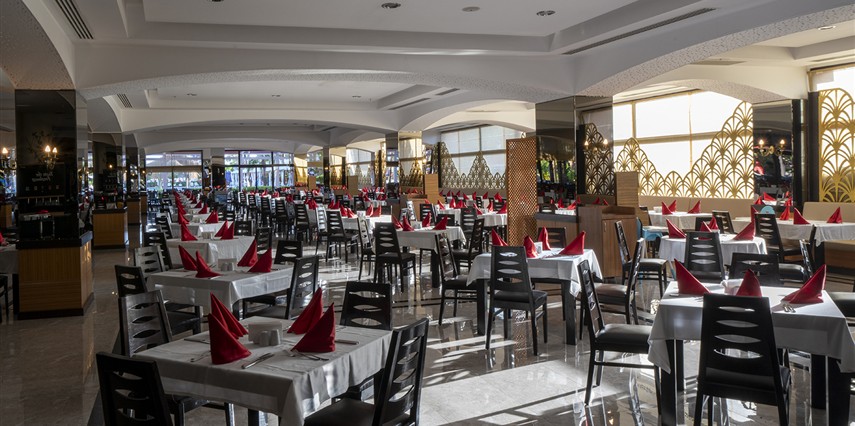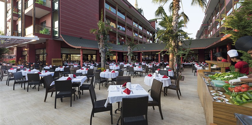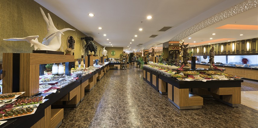 Sabah kahvaltısı, öğle ve akşam yemekleri açık büfe olup, tesisin belirlemiş olduğu markalar dahilinde bazı ithal alkollü içecekler ve alkolsüz içecekler 24 saat ücretsizdir. İmport Şampanyalar, Özel Şaraplar, Taze sıkılmış meyve suları, Yüksek Kalite Likörler Ve İmport İçecekler ücretlidir. Kahvaltıda alkollü içecek servisi yapılmamaktadır. Lobby Bar'da şişe biralar servis edilmektedir. Diğer içecekler şişe ile servis edilmemektedir . 18 yaş altına alkol servisi yapılmamaktadır. A La Carte Restaurantlar: Minimum 5 Gece konaklamalarda geçerli olmak üzere, tatil boyunca yukarıda belirtilen üç A La Carte Restauranttan tercih edilecek bir mutfakta bir kez ücretsiz rezervasyon yapılabilir. Ekstra rezervasyonlar ücretlidir. A'La Carte Restoran 12 yaş ve üzeri misafirler için hizmet vermektedir.