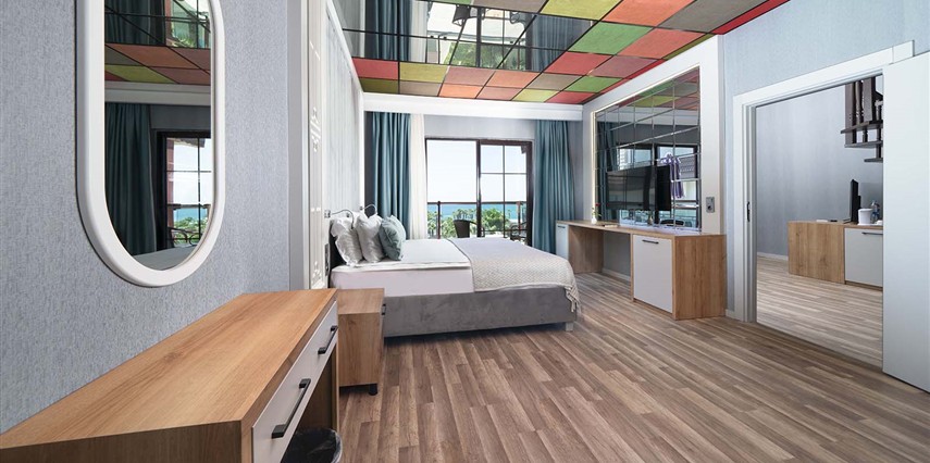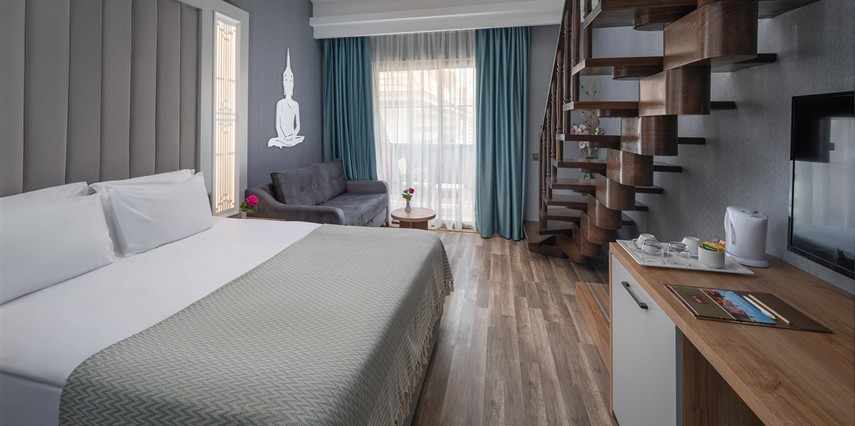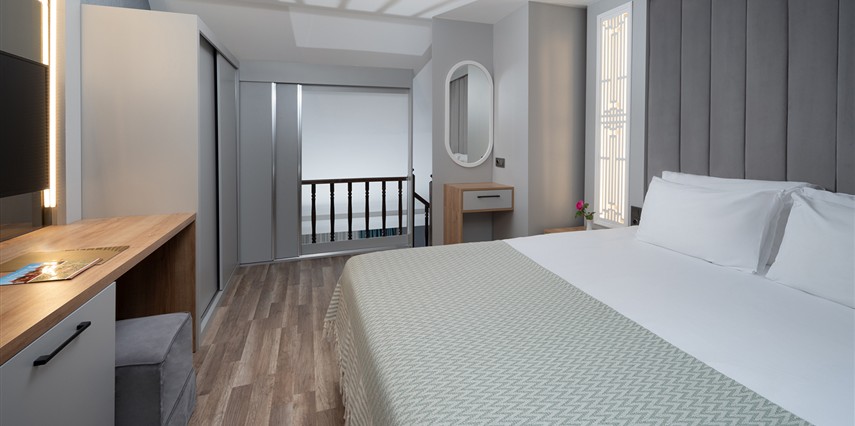 * Yandan Deniz Manzaralı Dublex Aile Odası; : 45m² genişliğinde olup dubleks şeklinde içten merdivenli ve 2 yatak odalıdır. Maksimum 4+1’ e kadar (1 kişi sofada) konaklama kapasitesine sahiptir. Alt katta 1 yatak odası Duş/WC, üst katta 1 yatak odası bulunmaktadır. Kara manzaralı ya da yandan deniz manzaralı seçenekleri bulunmaktadır. ( 125 oda ), yatak odaları alt ve üst katta bulunmaktadır, ara kapılı değildir, dubleks şeklindedir.