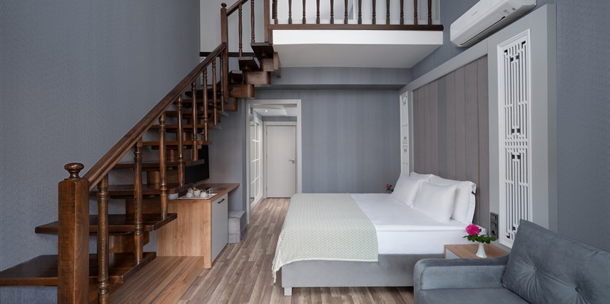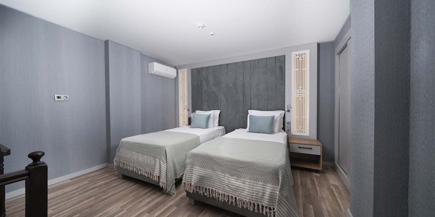 * Grand Suiti: 74 m² genişliğinde olup dubleks şeklinde içten merdivenli ve 2 yatak odalıdır. Alt katında 1 yatak odası, oturma odası, üst katında 1 yatak odası bulunmaktadır. Maksimum 5+1’ e kadar (2 kişi kanepede) konaklama kapasitesine sahiptir. 2 adet Duş/WC bulunmaktadır ve doğrudan deniz manzaralıdır. ( 6 oda )