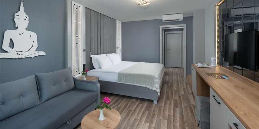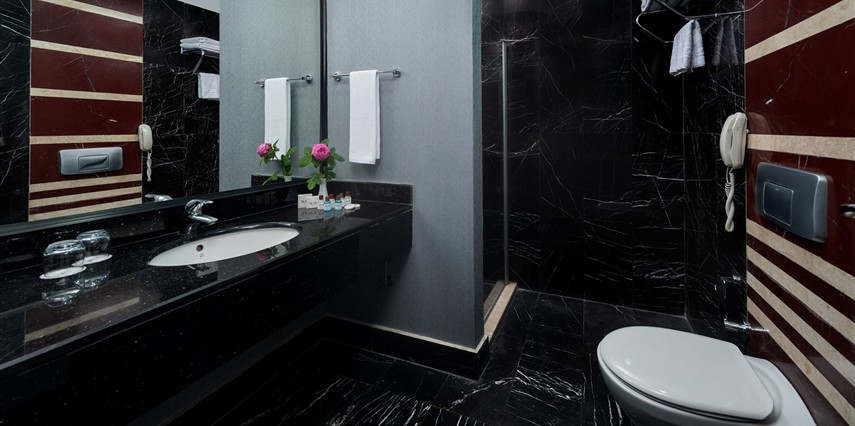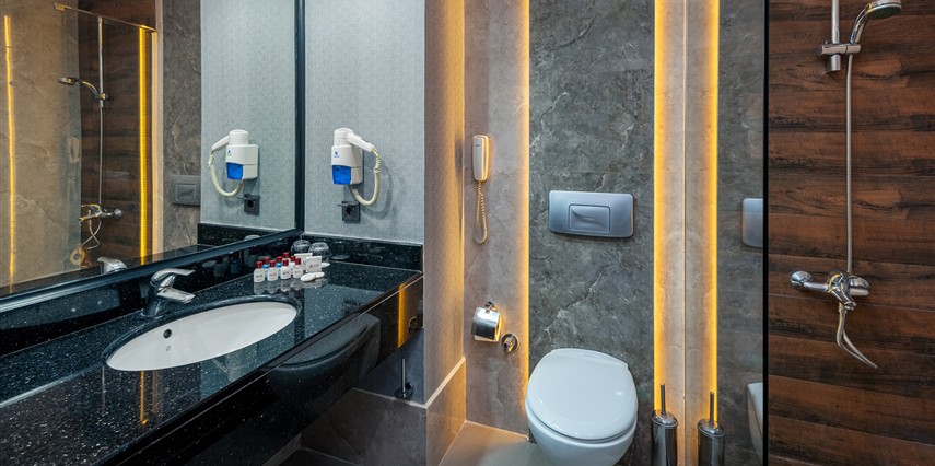 * Bütün odalarda split klima, emanet kasa, LCD TV, mini bar, yerler laminant parke, balkon (masa ve sandalye mevcut), çay kahve seti & elektrikli su ısıtıcısı, direkt telefon, kartlı kapı kilit sistemi, Wİ-Fİ bağlantısı (ücretsiz), yangın alarm ve söndürme sistemi bulunmaktadır. Banyoda; duş, wc, saç kurutma makinesi, telefon ve 220 Volt elektrik prizi mevcuttur.