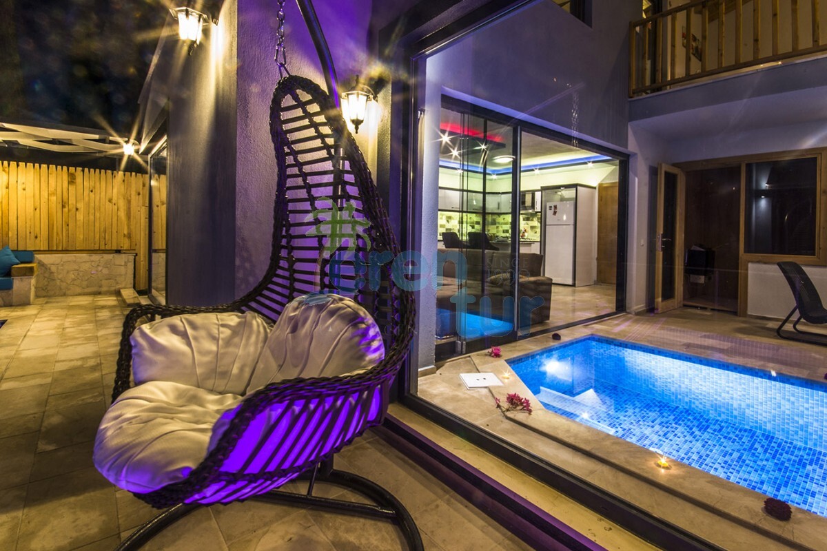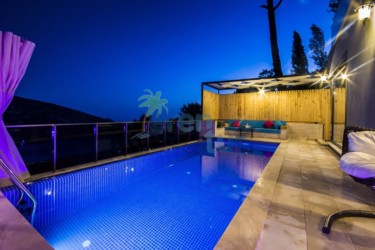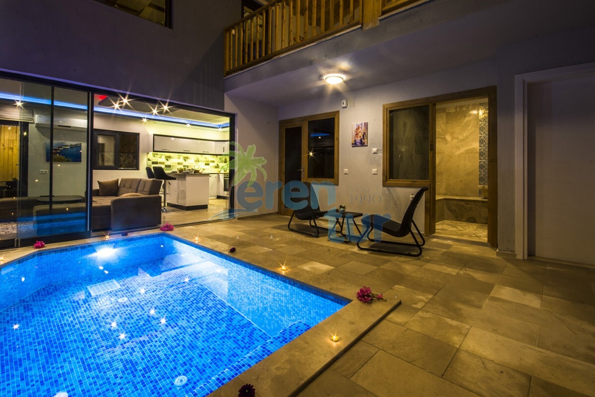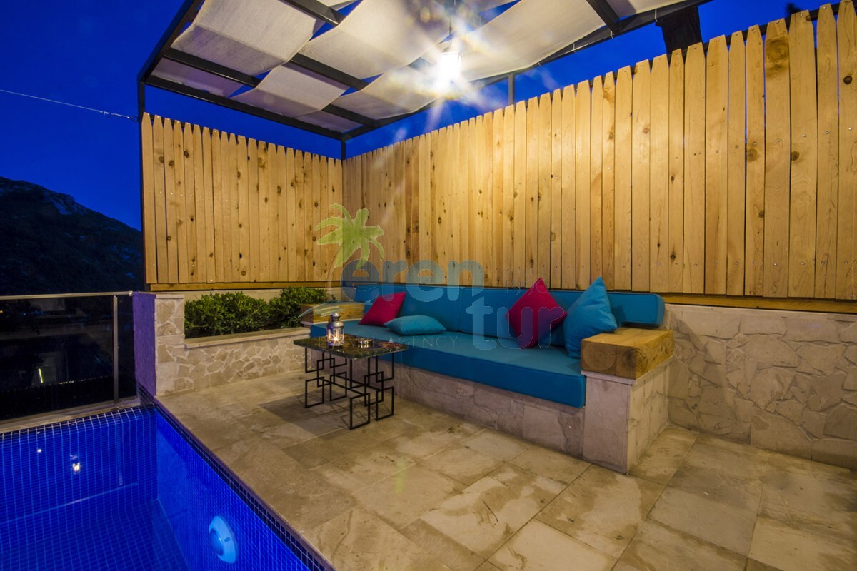 2019 yılında hizmete giren villamız, muhteşem doğal güzellikler içinde konumlanmaktadır. Kalkan şehir merkezine yaklaşık 12 km mesafede olan villamız, İslamlar Köyü merkezine 3.5 km uzaklıktadır. Havuz terası etrafı çit sistemi ile kapatılarak muhafazakâr aileler için uygundur. Galeri tarzında iki kattan oluşan villamızın alt katında, 3.50 cm / 2.50 cm ebatlarına sahip kapalı ısıtmalı havuz, sauna ve Türk hamamı bulunmaktadır. Bu sayede, balayı çiftleri ve müşterilerimiz kış dönemlerinde de keyifli bir tatil geçirebilirler.