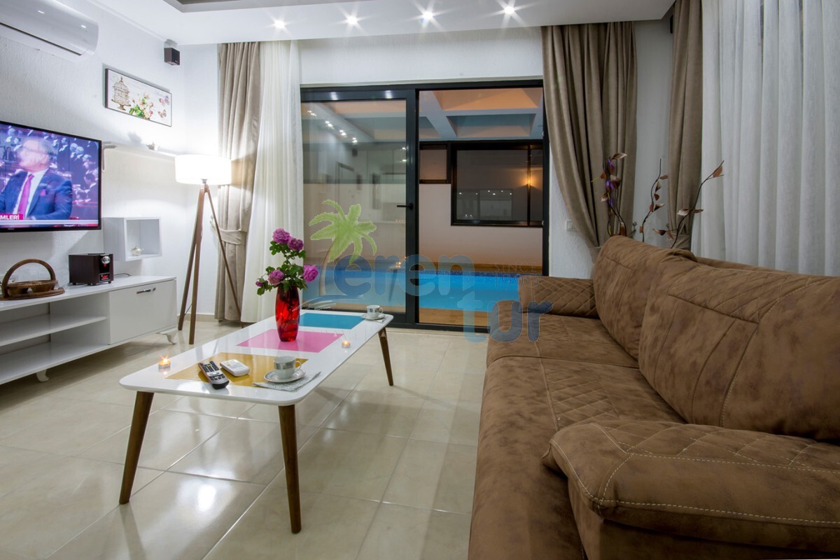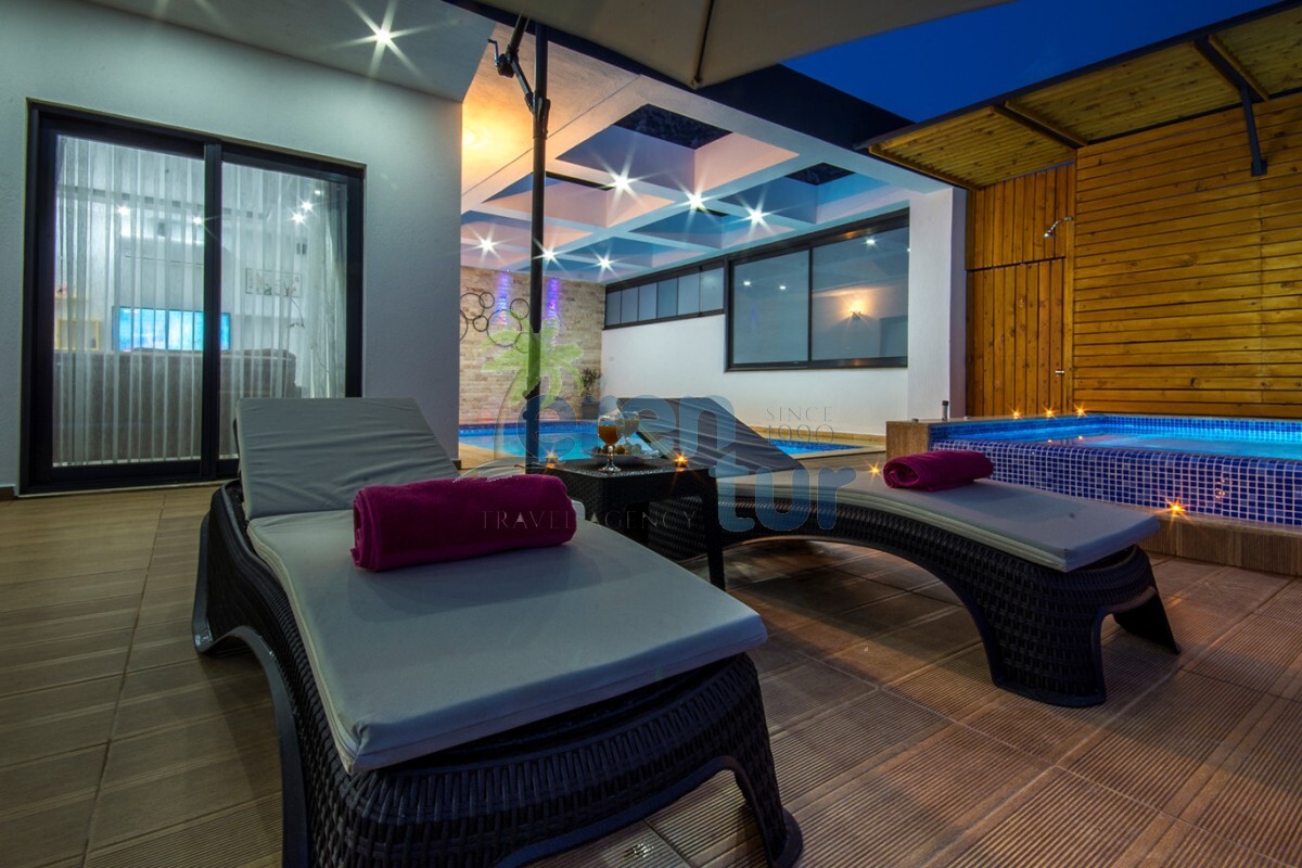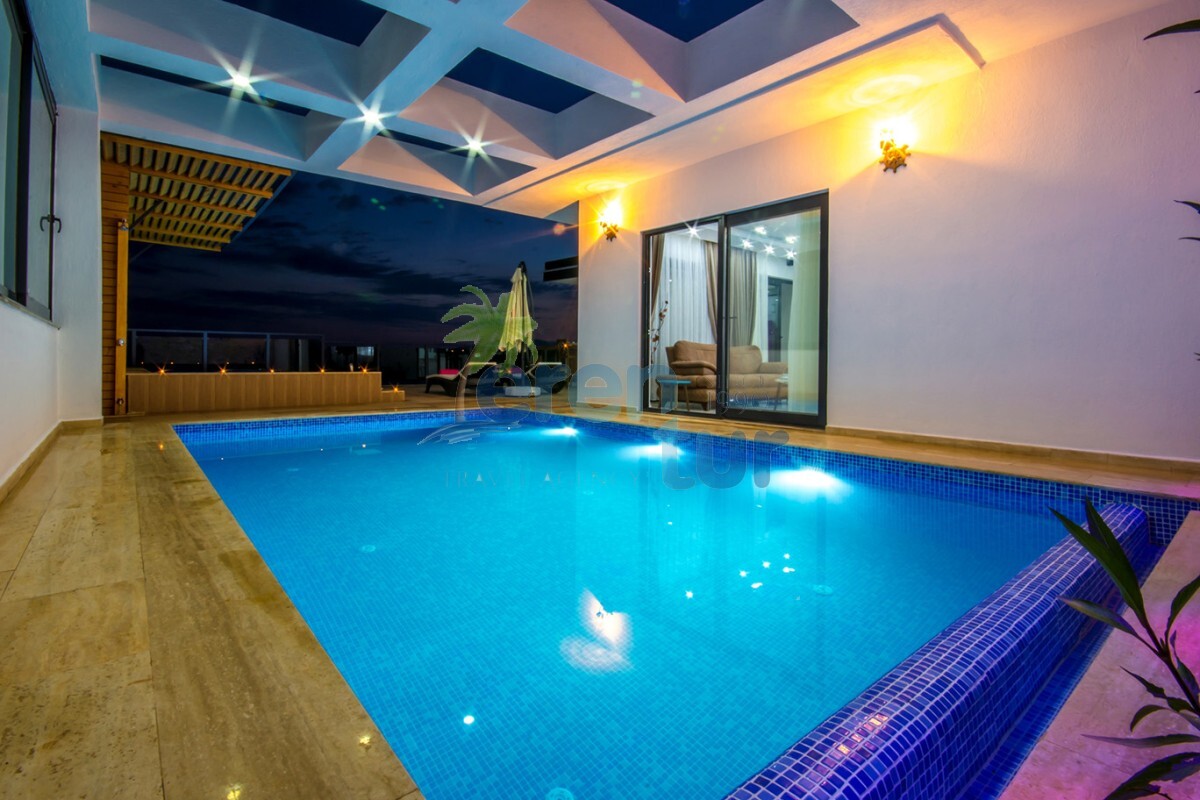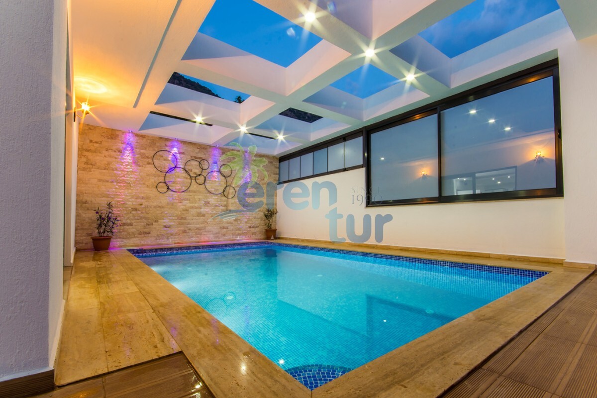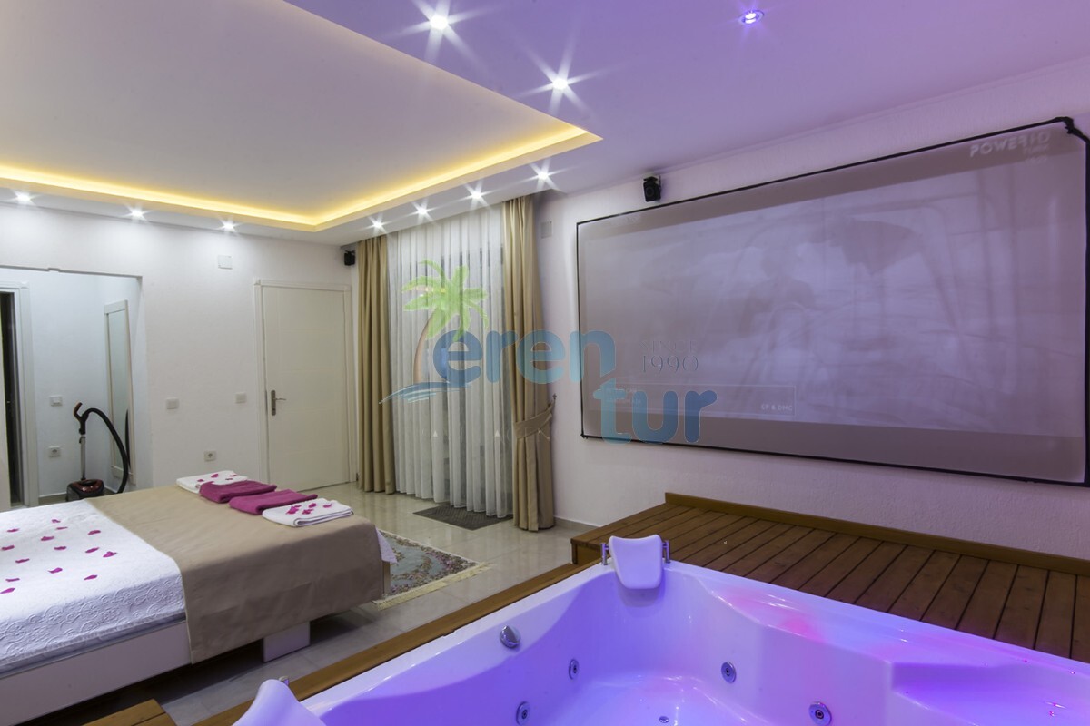 Değişik ve modern mimari ile ön plana çıkan villamızda konuklarımızın keyifli anlar geçirmesi için birçok farklı alan dizayn edilmiş ve uygulanmıştır. Villamız Balayı çiftlerimizin mahremiyeti açısından L şeklinde inşaa edilmiş, yan tarafları koruma altına alınmış havuz bina yanına içeriye çekilmiştir. Sonbahar ve Kış dönemlerinde kullanılabilmesi açısından üst kısmı ve ön kısmı katlanır cam ile kapatılmış olup havuz ısıtma dahil edilmiştir, konuklarımıza kapalı havuz olarak hizmet vermektedir.