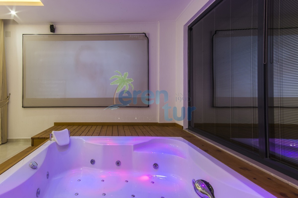 Havuz terasımızın kenarında manzaraya karşı keyif yapabilmeniz için büyük ebat bir hidromasaj jakuzili keyif havuzu bulunmaktadır. Bu havuzun oturaklarında içeceklerinizi yudumlarken manzaranın da keyfini çıkarabilirsiniz. Villamızın önünde bulunan camlar tek taraflı görünür olup (One Way Vision kaplamadır) gündüzleri dışarıdan görülmez hale gelir. Ancak siz içeriden manzara keyfinden mahrum kalmadan dışarıyı görebileceksiniz. Yine havuz terasında bulunan barbekü tezgahında ve bar da akşam yemeklerinizi muhteşem manzaraya karşı yiyebilir, kesintisiz mangal keyfi yapabilirsiniz. Villamızın havuzu kış dönemleri için havuz ısıtma sistemi bulunmaktadır ayrıca havuzun ön tarafı katlanır cam ile kapatılarak kapalı hale getirilmektedir kış dönemlerinde (OCAK-ŞUBAT MART-NİSAN-EKİM KASIM ARALIK ) aylarında 2024 yılı havuz ısıtma için günlük 750 TL ek ücret talep edilmektedir ısıtma sistemleri giriş tarihinden 1 gün önce açıldığı için minimum 2 gece konaklamalı da 3 gecelik ısıtma ücreti talep edilecektir.Havuz ısıtma sistemi 24 derece ile 29 derece arasında ısı sağlamaktadır.ısı derecesi hava şartlarına göre değişiklik gösterebilir.Kış döneminde ısıtma isteyen müşterilerimiz girişlerine en az 2 gün kala bilgi vermeleri gerekmektedir.Villamız içinde ihtiyacınız olan tüm mobilya mutfak araç gereçleri ütü saç kurutma makinesine kadar mevcuttur.