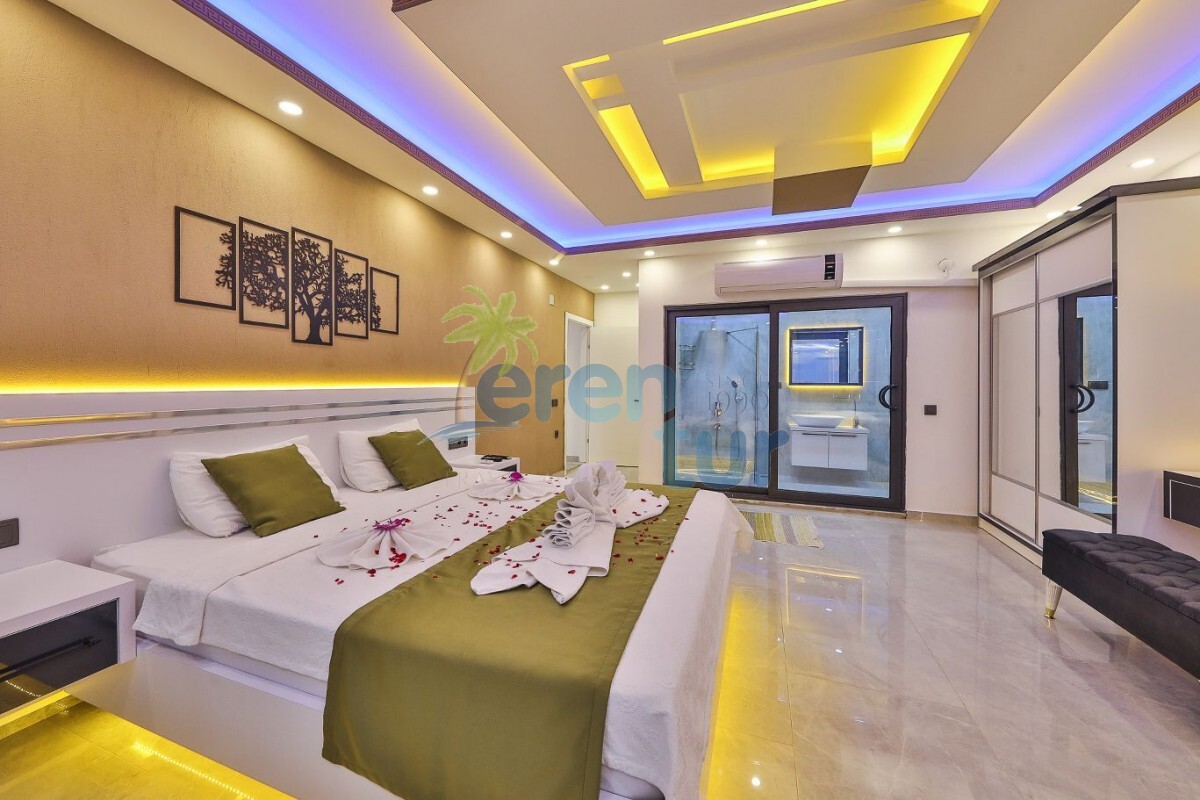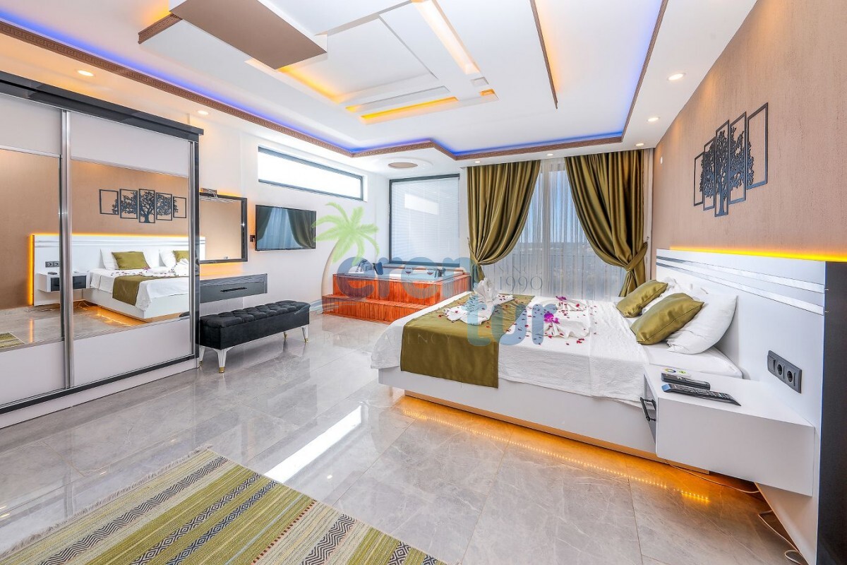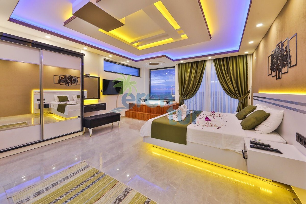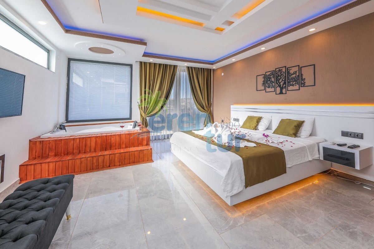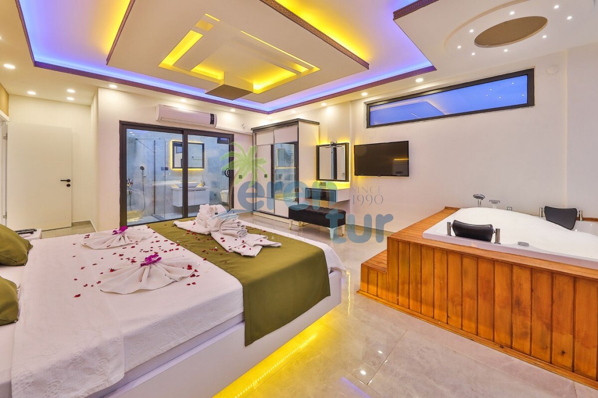 1. Yatak Odası: Lüks yatak, jakuzi, televizyon, klima, gardırop, komidin ve özel banyo-WC bulunan süit yatak odası mevcuttur.