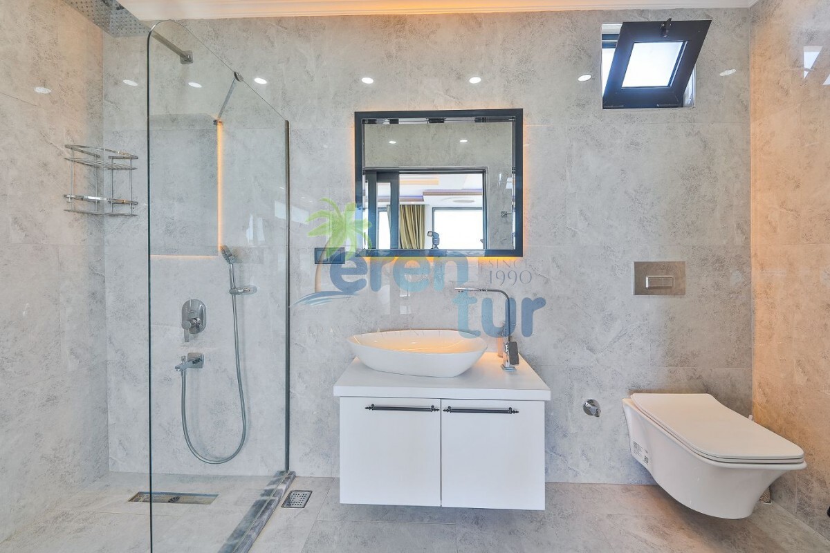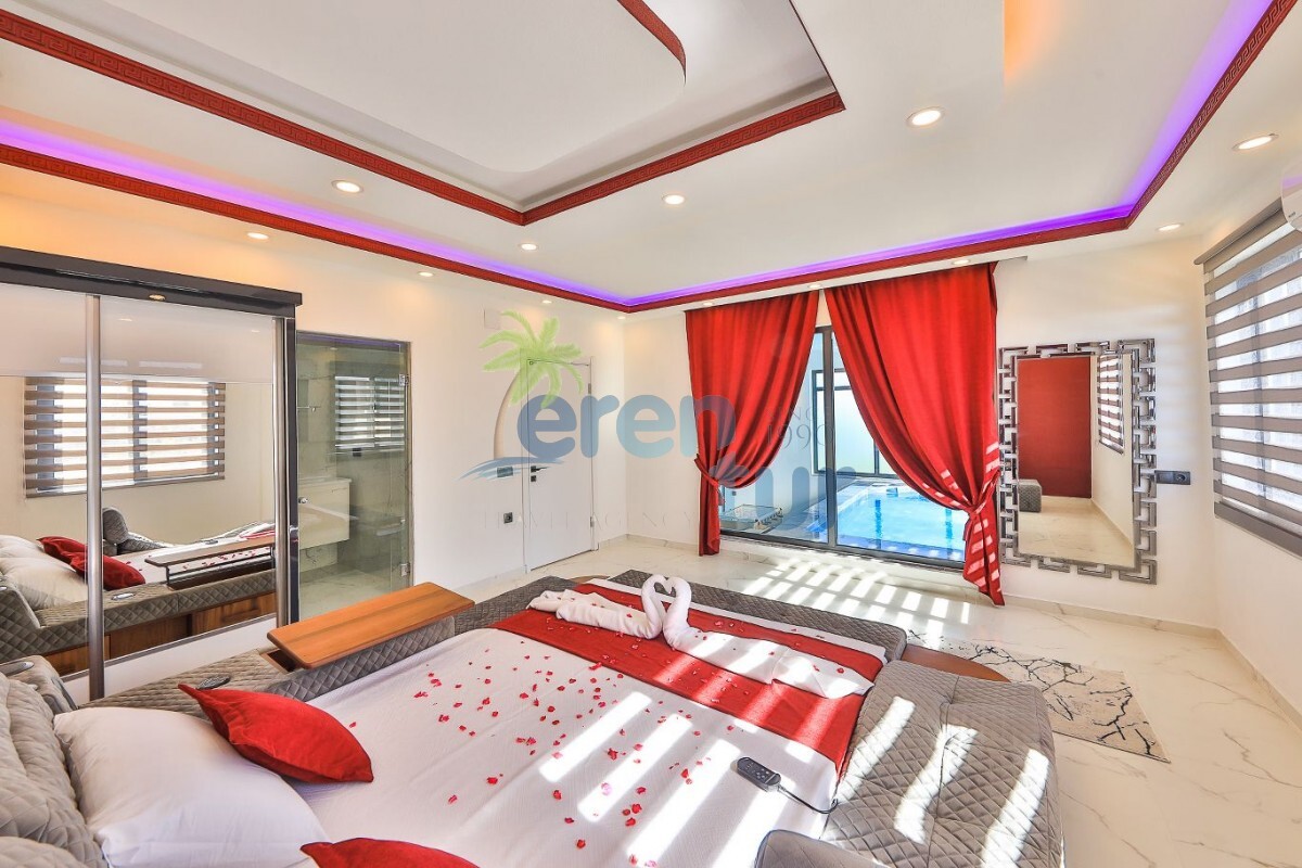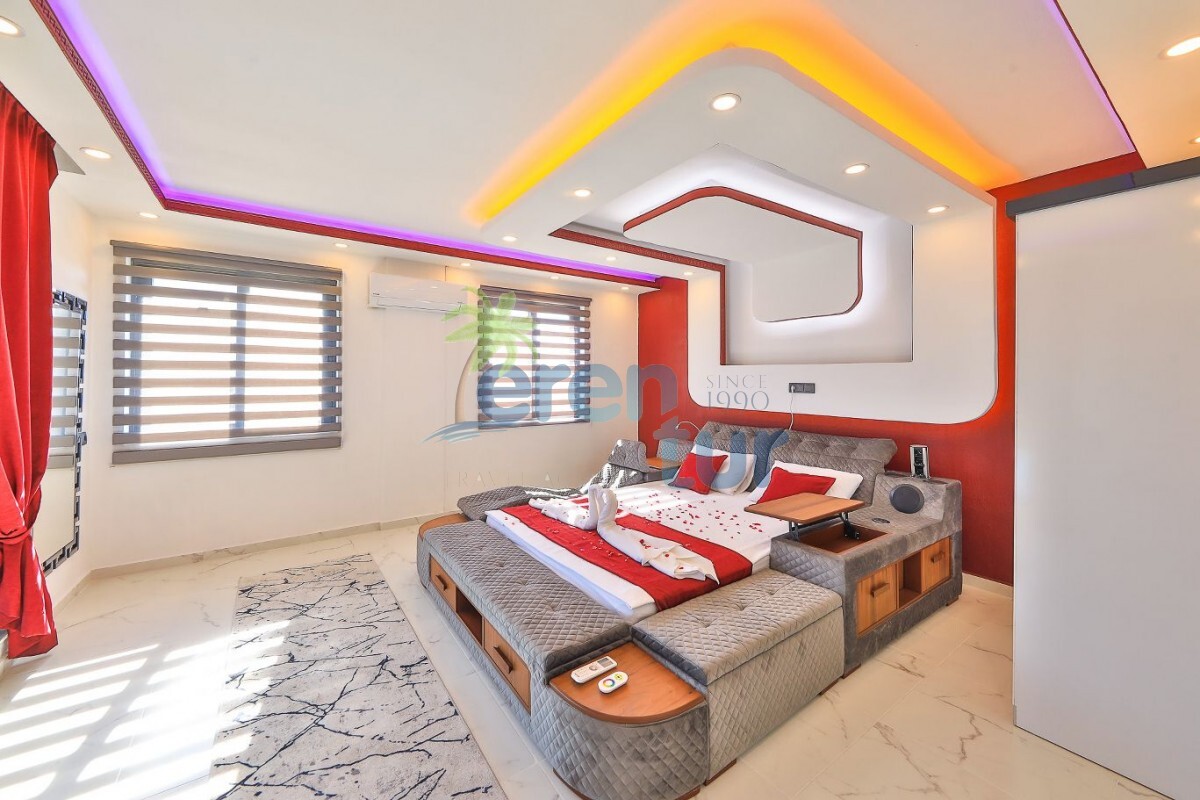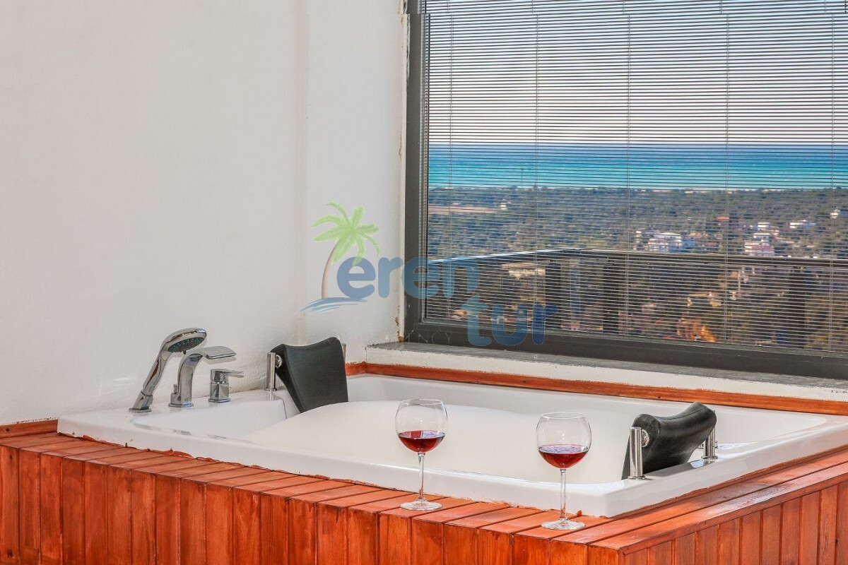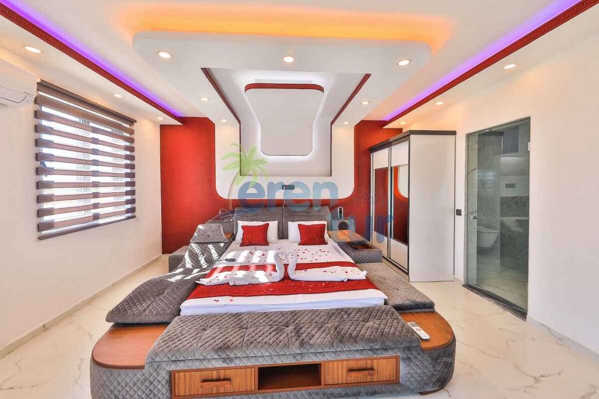 1. Yatak Odası: Lüks yatak, jakuzi, televizyon, klima, gardırop, komidin ve özel banyo-WC bulunan süit yatak odası mevcuttur.
