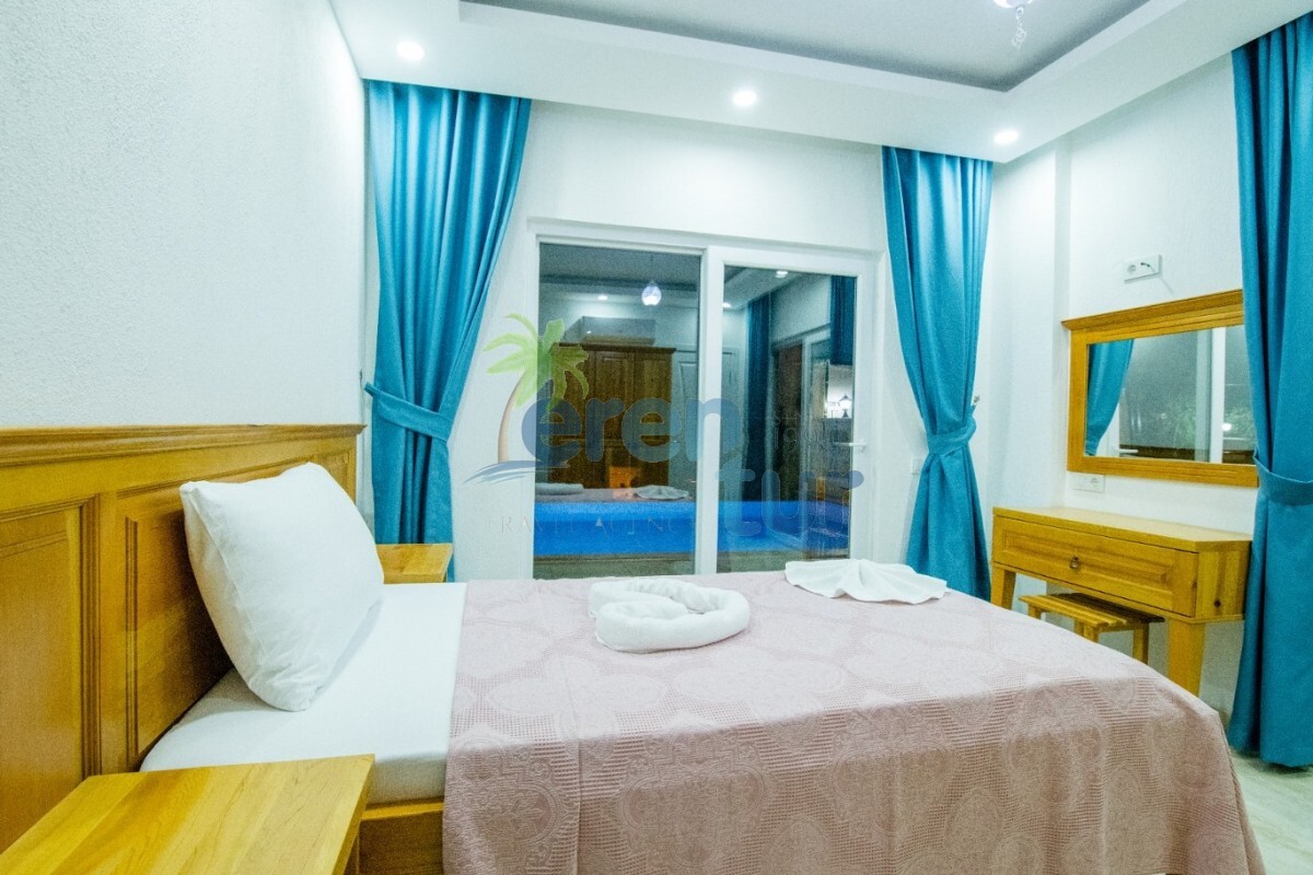 4. Yatak Odası : tek kişilik yatak klima, elbise dolabı, komodini makyaj masası, banyo ve lavabodan oluşmaktadır. Salon : salonunda sizi şık bir oturma grubu ile klima, TV, internet, uydu, ütü, ütü masası, koltuk, sehpa ve 6 kişilik yemek masası Salondan havuz başına çıkış vardır.
