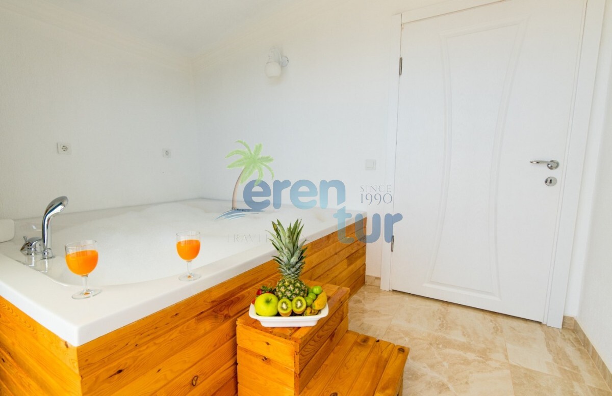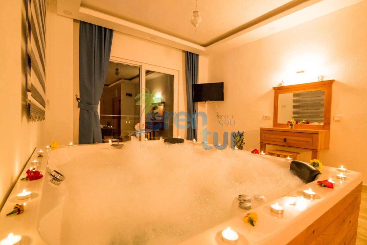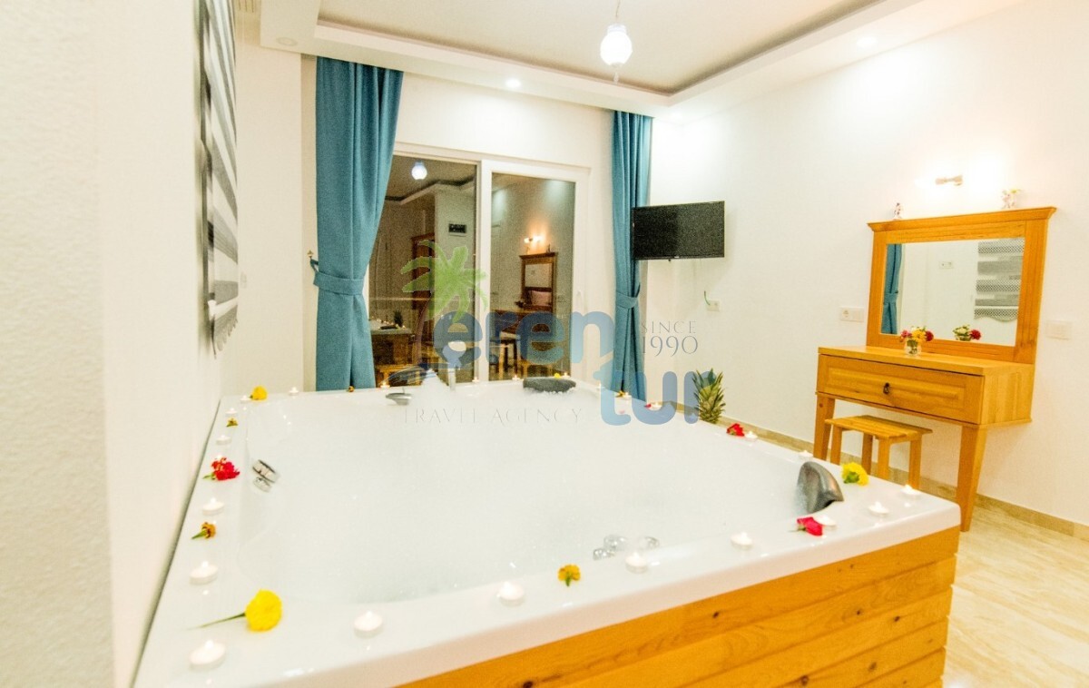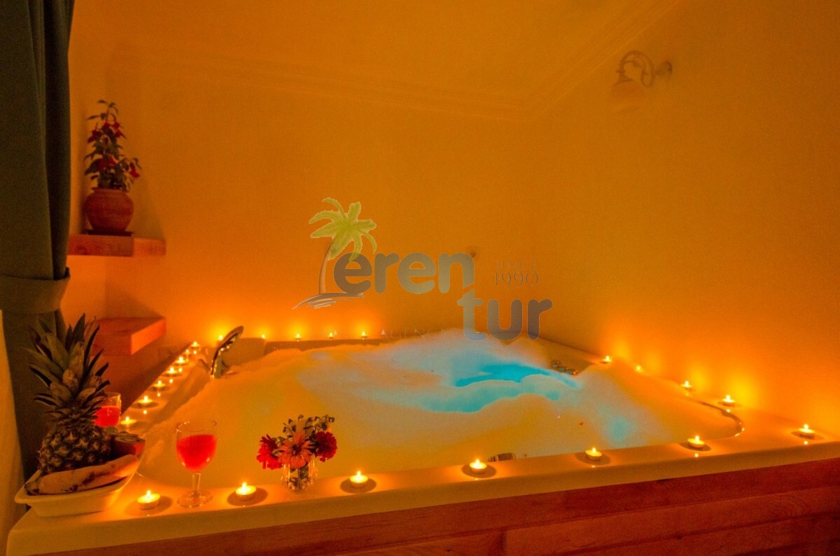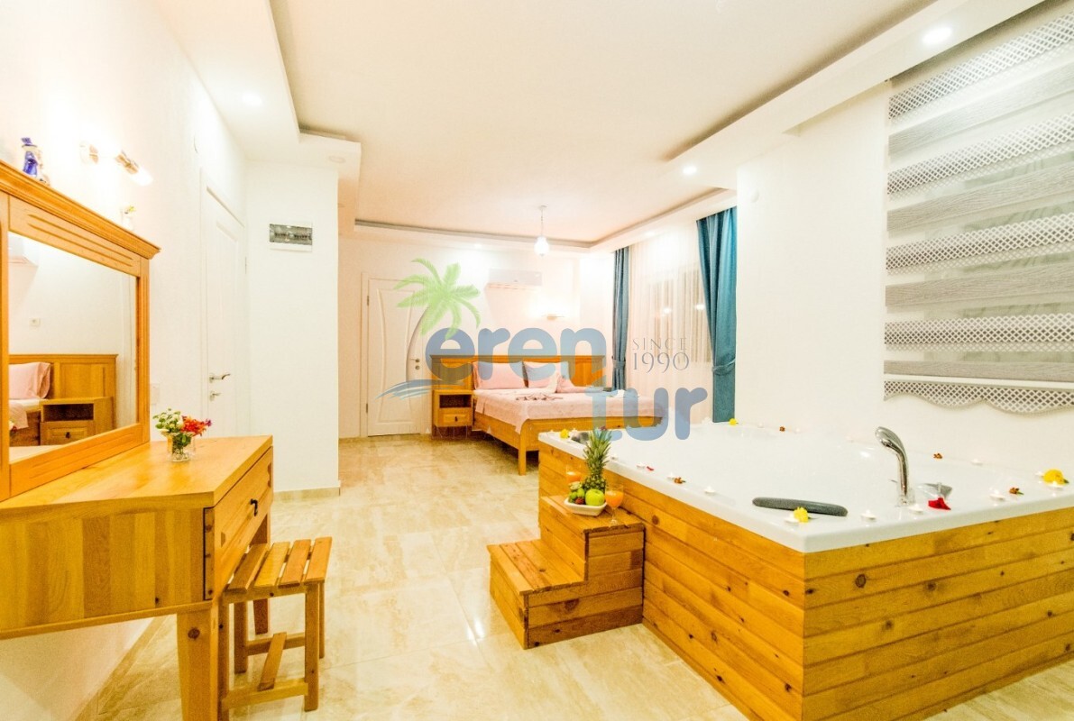 1. Yatak Odası : İki kişilik yatak klima komodin elbise dolabı, makyaj masası, banyo ve lavabodan oluşmaktadır. Bu odamızda jakuzi seçeneği var.