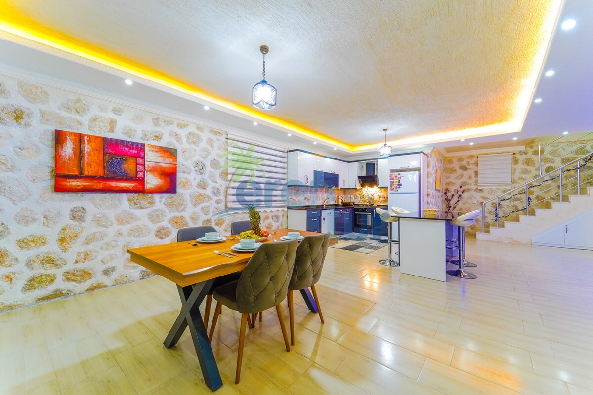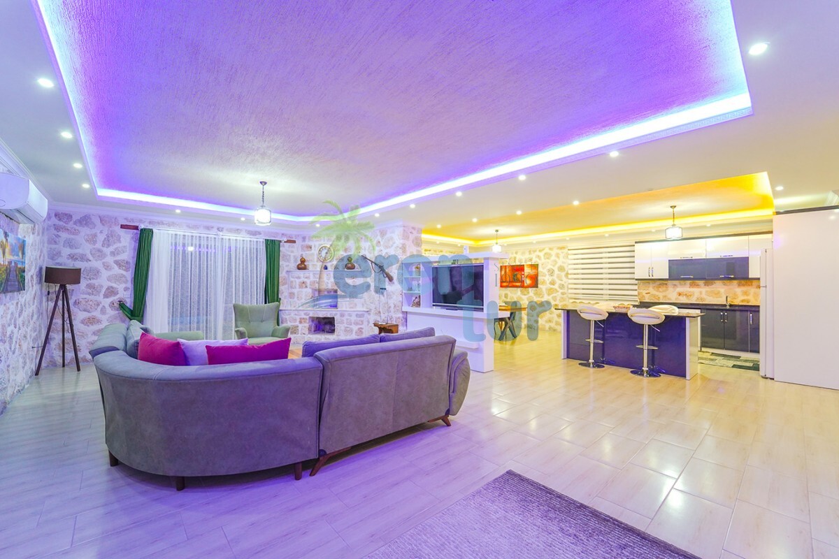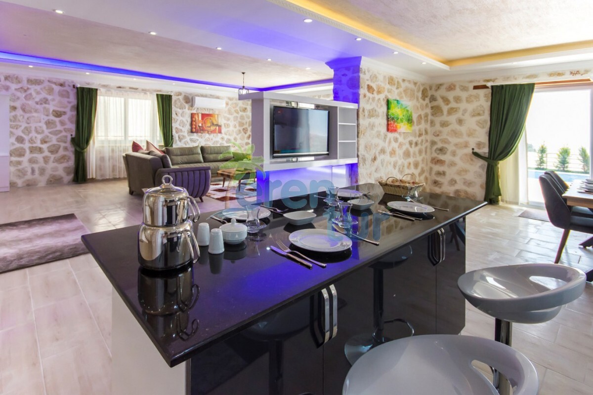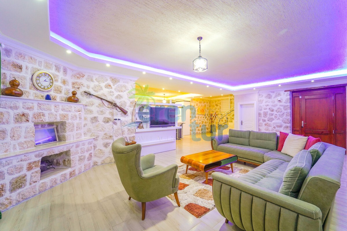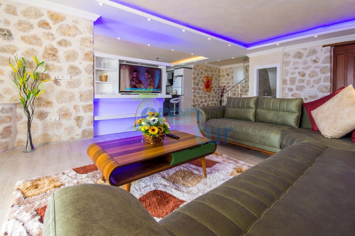 2018 yaz sezonu ilk defa kiraya çıkan villamız, taş ve modern konseptin birleşiminden oluşmaktadır. Oldukça geniş ve alanları ile ferah bir tatilin keyfini yaşayacaksınız. 2 kattan oluşan villamız , ilk katta oturma odası, açık plan mutfak yemek salonu ve bir küçük wc bulunmaktadır. Oturma odası ve yemek salonunu ayıran özel dizayn döner TV ünitesi iki tarafa birden de dönerek istediğiniz yerden Tv izleme keyfiniz sizlere sunacaktır. Mutfak önündeki küçük barda küçük atıştırmalar yapabilirsiniz. Merdivenler ile ulaşılan ikinci katta ise yatak odaları bulunmaktadır. Her iki yatak odasında TV yayını, banyo ve muhteşem manzaralı balkon bulunmaktadır. Ana yatak odasında 1.90 mt x 1.50 mt ebatlarında büyük boy bir sıcak su jakuzisi vardır. Ayrıca çamaşır odası bulunmaktadır.