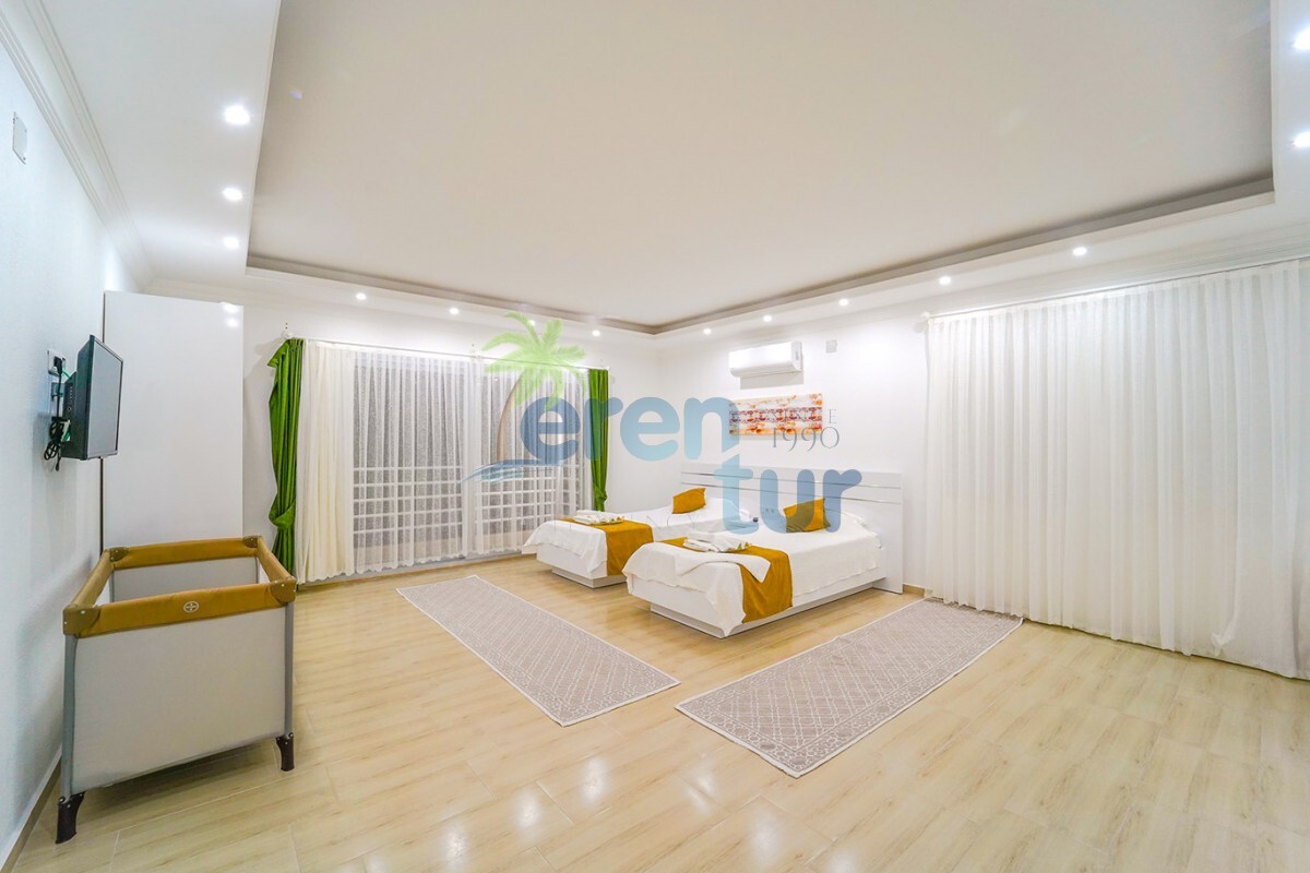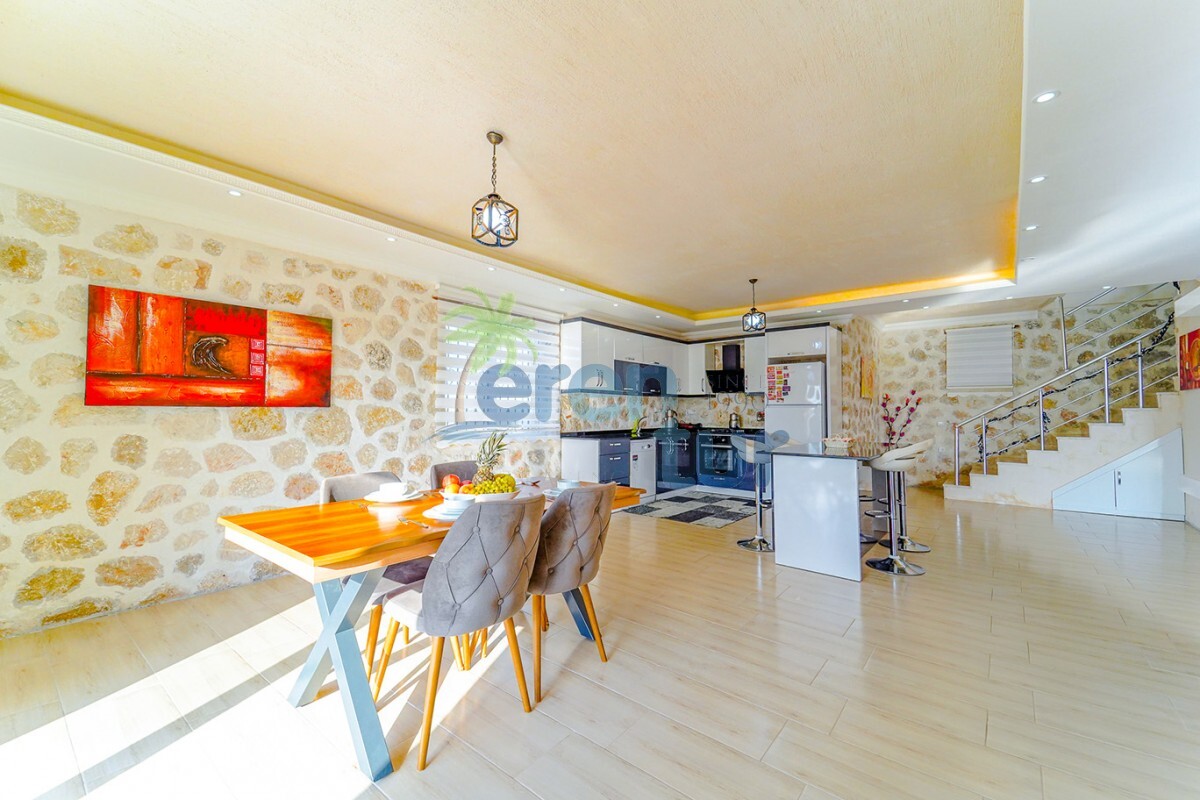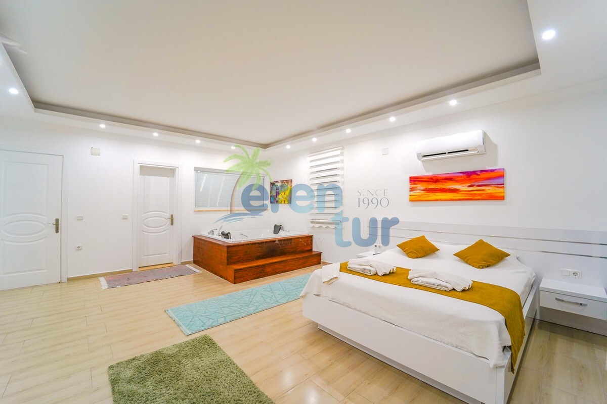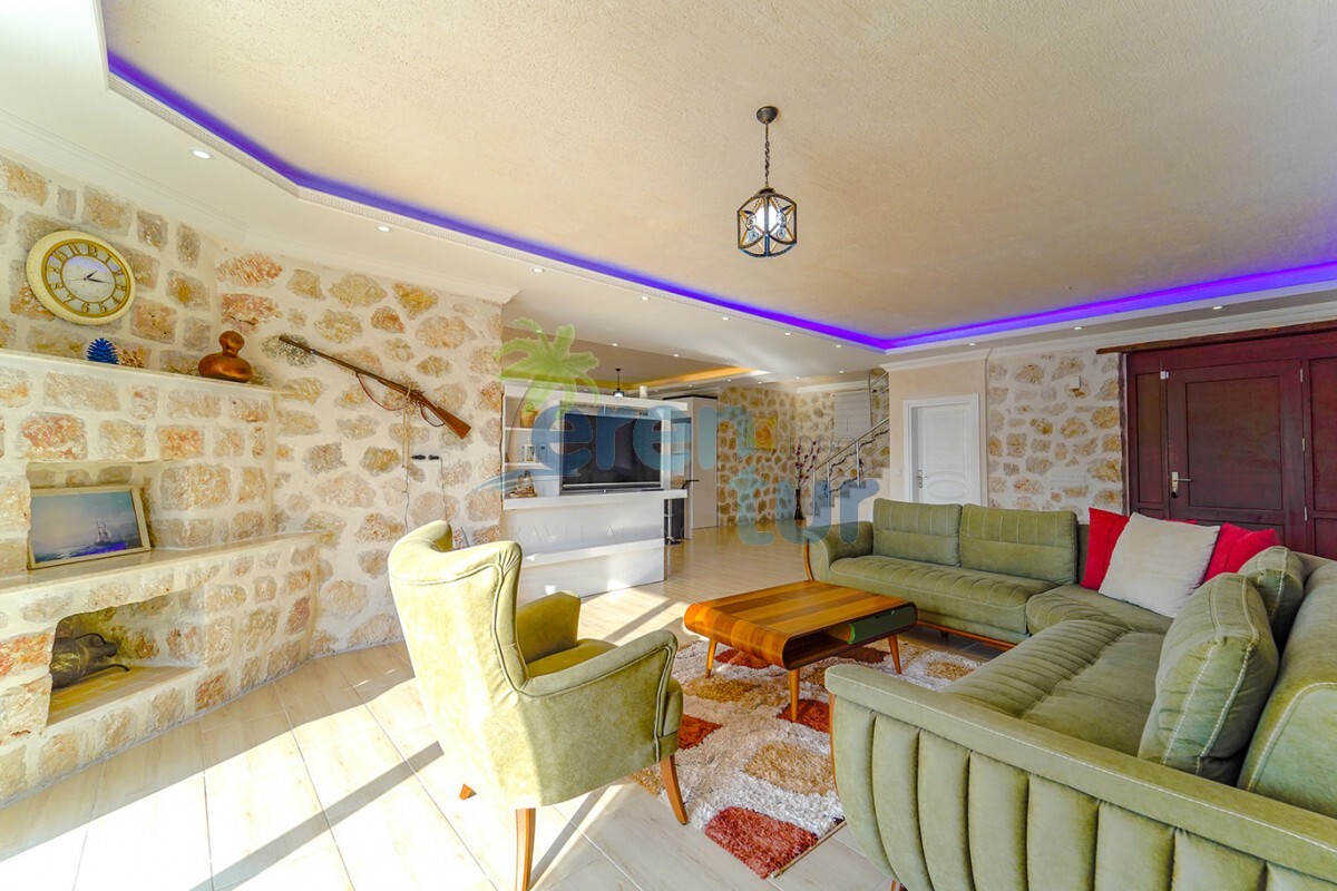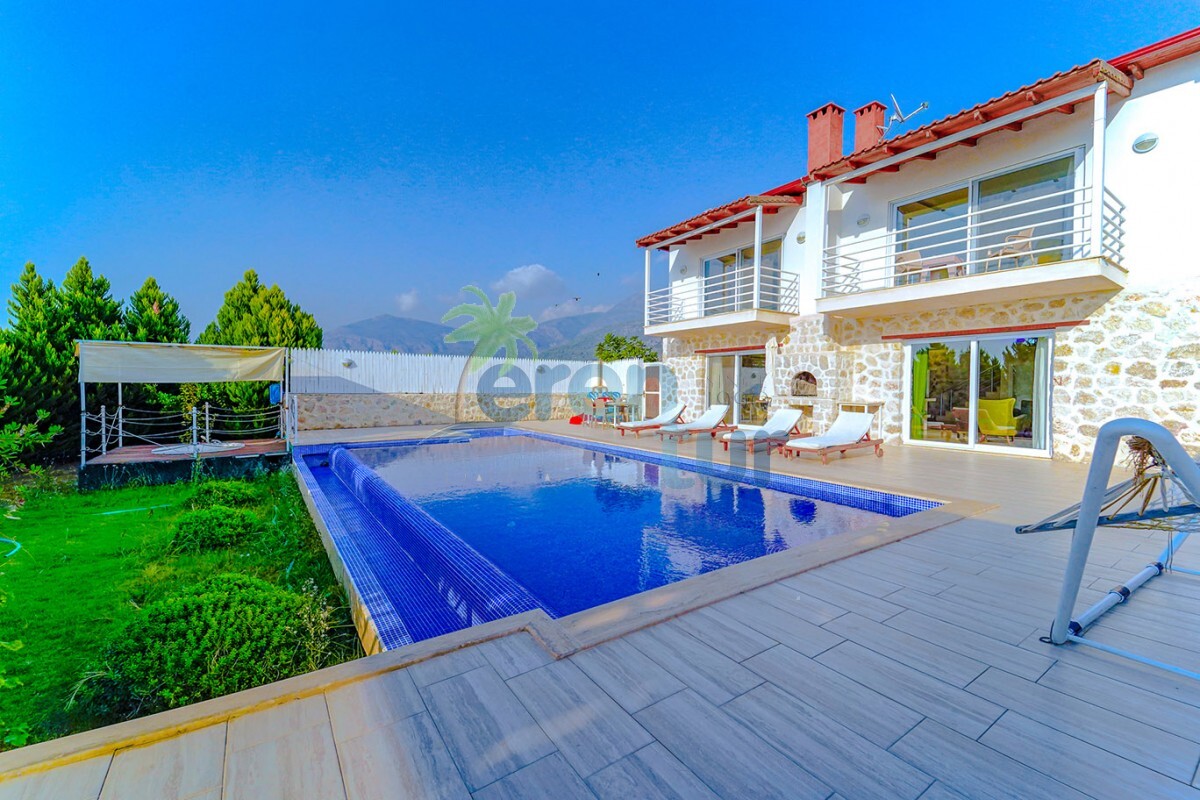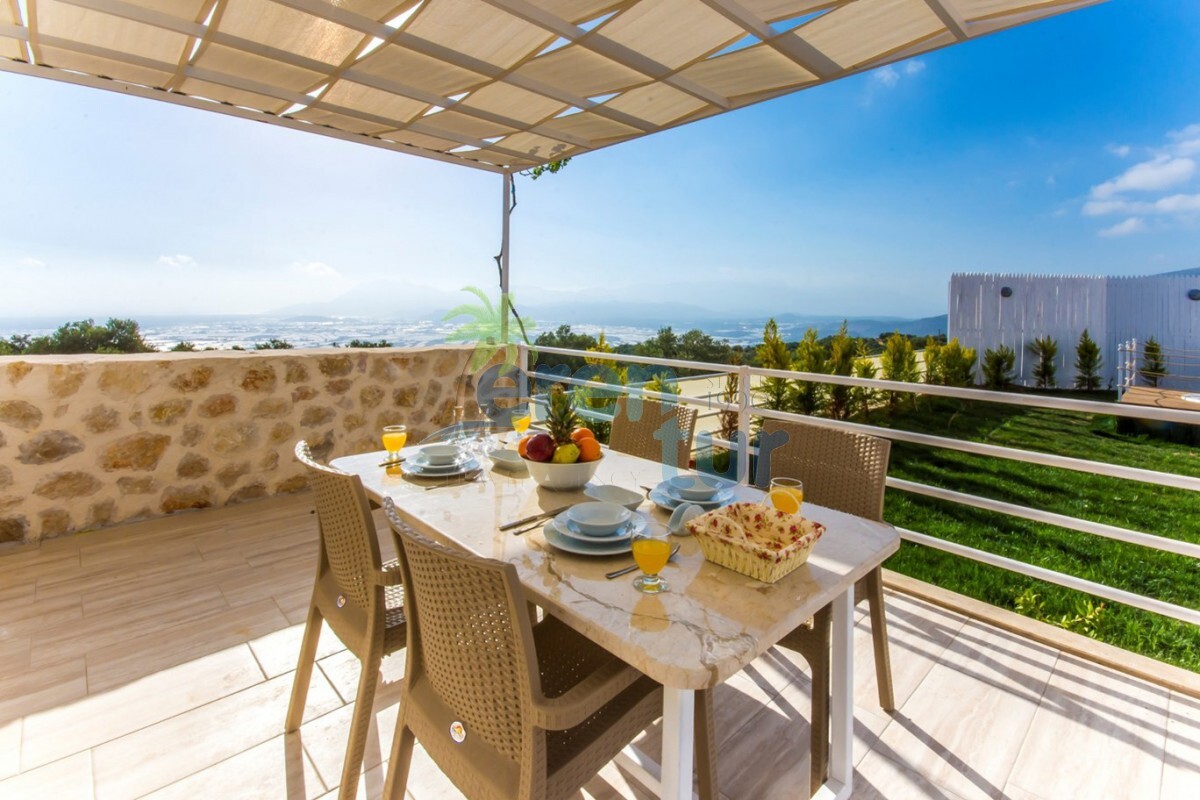 2018 yaz sezonu ilk defa kiraya çıkan villamız, taş ve modern konseptin birleşiminden oluşmaktadır. Oldukça geniş ve alanları ile ferah bir tatilin keyfini yaşayacaksınız. 2 kattan oluşan villamız , ilk katta oturma odası, açık plan mutfak yemek salonu ve bir küçük wc bulunmaktadır. Oturma odası ve yemek salonunu ayıran özel dizayn döner TV ünitesi iki tarafa birden de dönerek istediğiniz yerden Tv izleme keyfiniz sizlere sunacaktır. Mutfak önündeki küçük barda küçük atıştırmalar yapabilirsiniz. Merdivenler ile ulaşılan ikinci katta ise yatak odaları bulunmaktadır. Her iki yatak odasında TV yayını, banyo ve muhteşem manzaralı balkon bulunmaktadır. Ana yatak odasında 1.90 mt x 1.50 mt ebatlarında büyük boy bir sıcak su jakuzisi vardır. Ayrıca çamaşır odası bulunmaktadır.