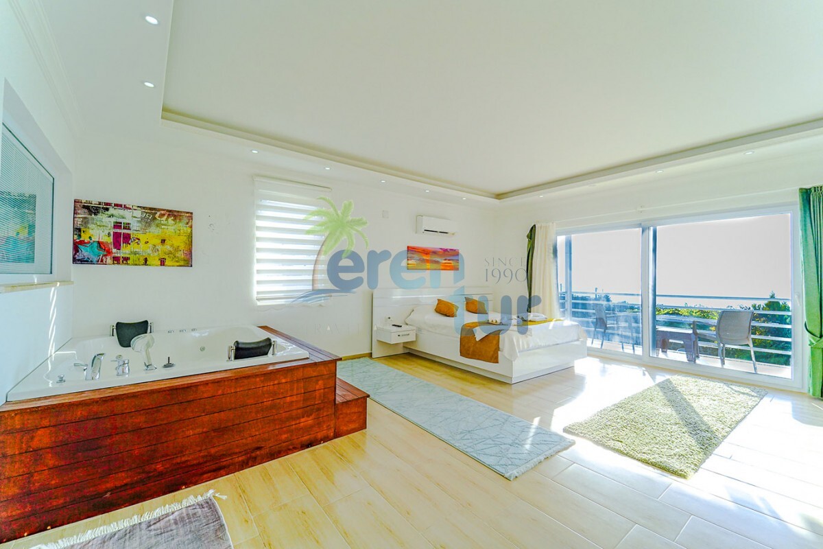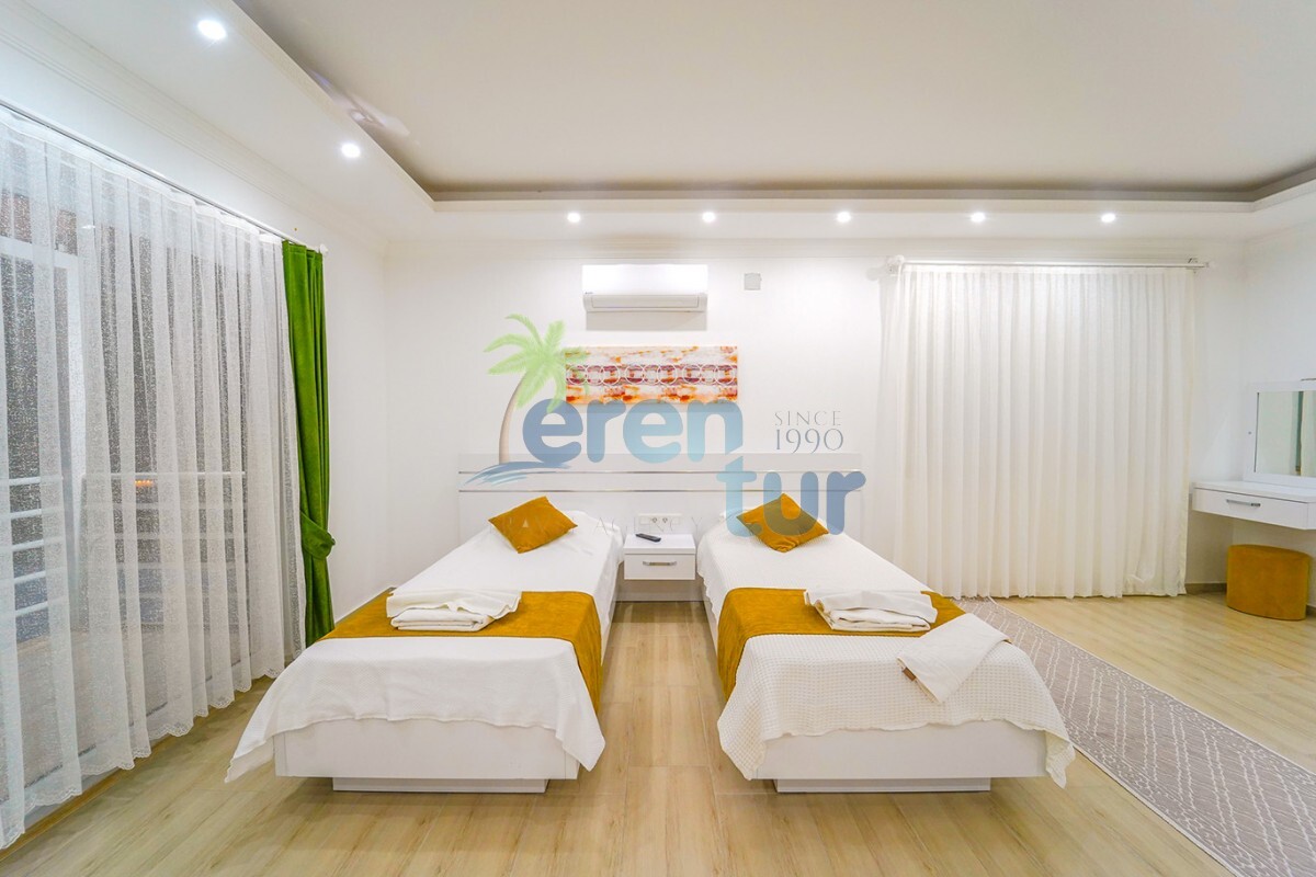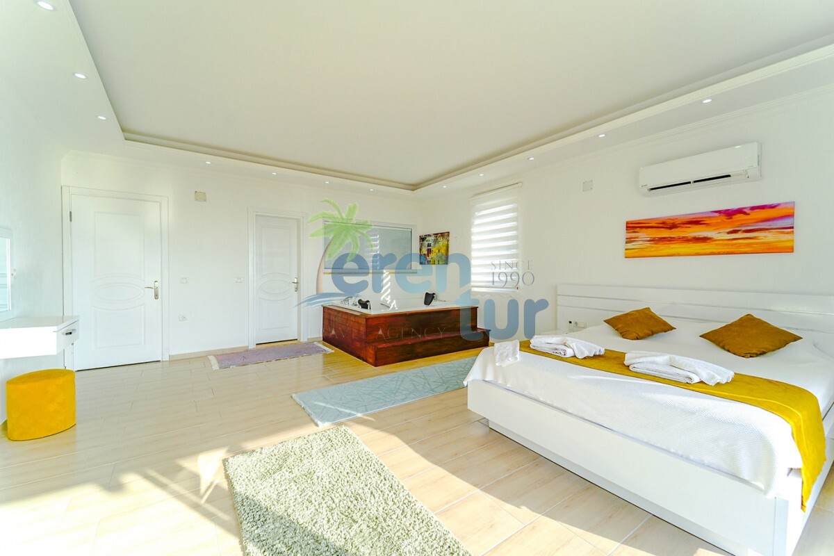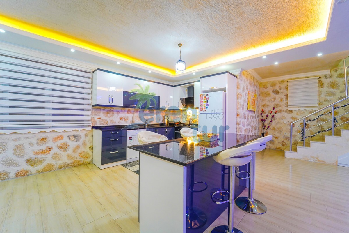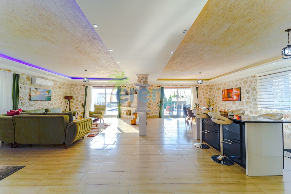 2018 yaz sezonu ilk defa kiraya çıkan villamız, taş ve modern konseptin birleşiminden oluşmaktadır. Oldukça geniş ve alanları ile ferah bir tatilin keyfini yaşayacaksınız. 2 kattan oluşan villamız , ilk katta oturma odası, açık plan mutfak yemek salonu ve bir küçük wc bulunmaktadır. Oturma odası ve yemek salonunu ayıran özel dizayn döner TV ünitesi iki tarafa birden de dönerek istediğiniz yerden Tv izleme keyfiniz sizlere sunacaktır. Mutfak önündeki küçük barda küçük atıştırmalar yapabilirsiniz. Merdivenler ile ulaşılan ikinci katta ise yatak odaları bulunmaktadır. Her iki yatak odasında TV yayını, banyo ve muhteşem manzaralı balkon bulunmaktadır. Ana yatak odasında 1.90 mt x 1.50 mt ebatlarında büyük boy bir sıcak su jakuzisi vardır. Ayrıca çamaşır odası bulunmaktadır.
