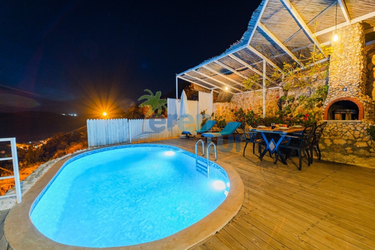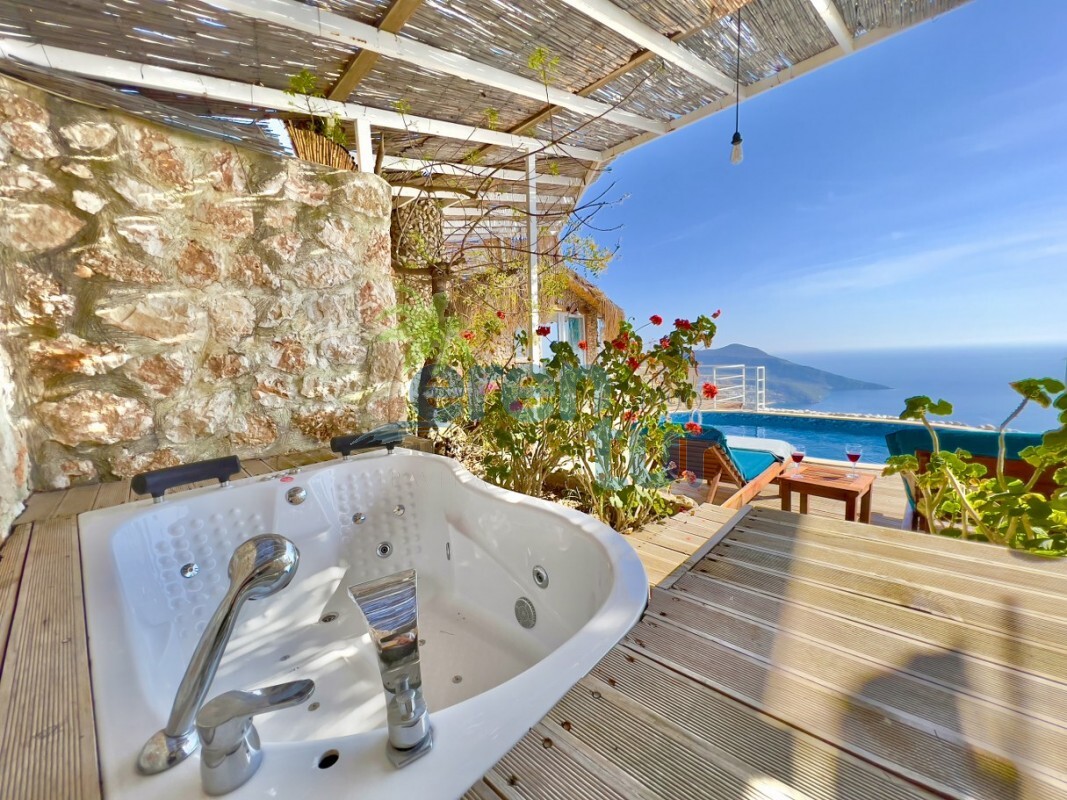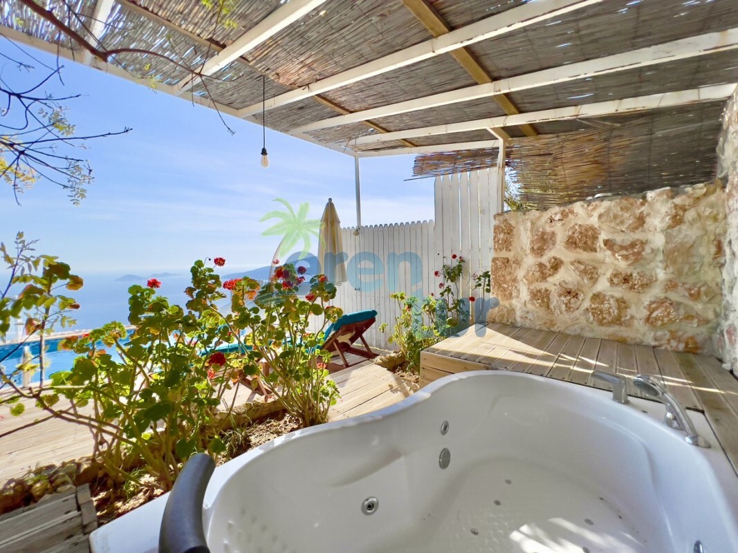 Bu muhteşem konsept tatil villaları Kalkan'ın Kızıltaş mevkiinde, harika bir manzaraya sahip olan üst tarafında yer alıyor. Villalar, tek yatak odası ile 2 kişilik kapasiteye sahip olup, çocuklu aileler için ise oturma odasında bulunan açılır kanepe ile birlikte 1 çocuğun konaklamasına uygun hale getirilmiştir. Kalkan koyunun en güzel manzarasına sahip olan konumu ile doğa ile bütünleşmiş ve etraftan görünmeyen özelliğe sahiptir. Demir, ahşap ve taş yapısı ile estetik bir görünüme sahiptir. Villamızın 2018 yılında arka tarafına yol yapılmıştır ve otopark kısmına kadar araç ile çıkılabilmektedir. Villamızın bütün odaları ve havuz terası muhteşem Kalkan koyu manzarasına bakmaktadır. Ayrıca yatak odasında bulunan jakuzi de manzarayı görecek şekilde cam önüne yerleştirilmiştir. İki bina birbirini görmeyecek şekilde konumlandırılmıştır. Ancak görünecek noktalar olursa hasır, perde vs... yöntemler ile görünmezlik sağlanmış ve muhafazakar ailelerimize ve balayı villa konsepti arayan müşterilerimiz için uygun hale getirilmiştir.