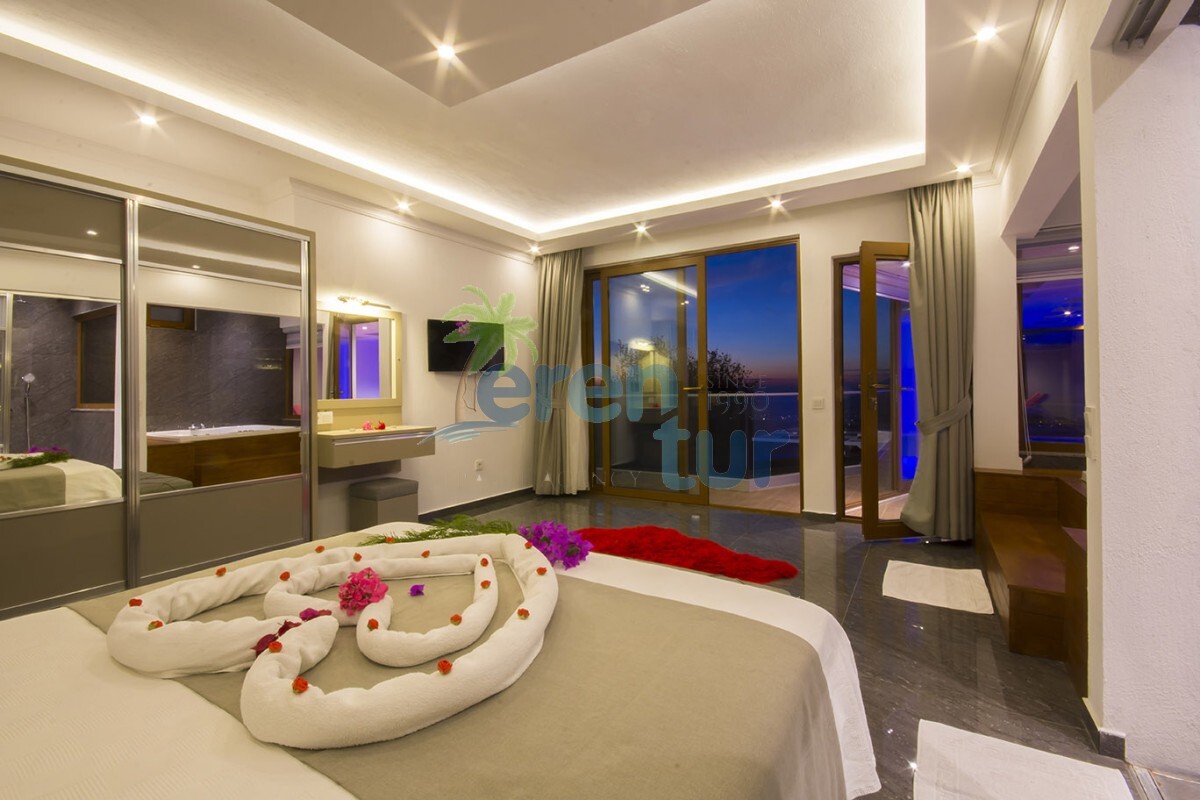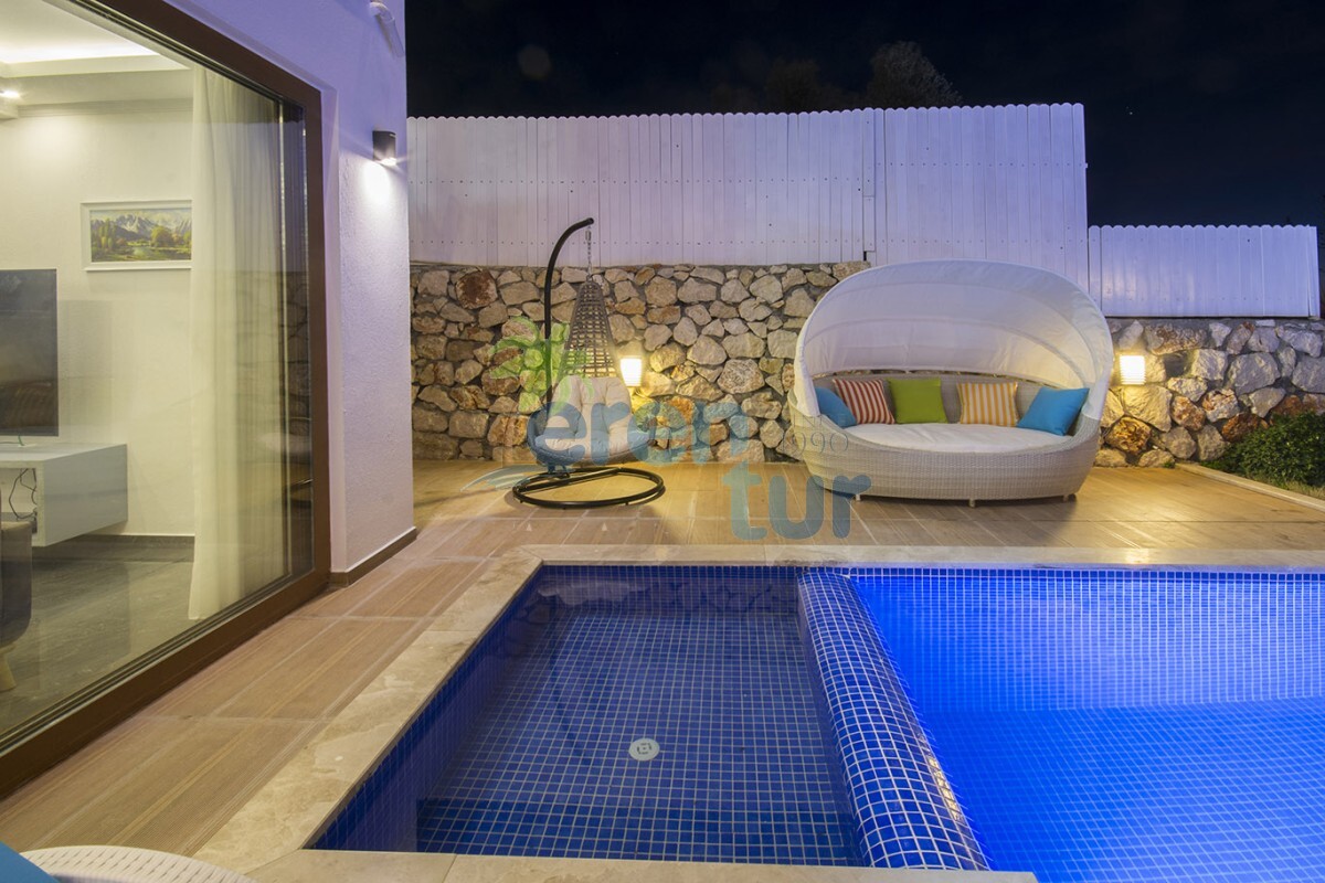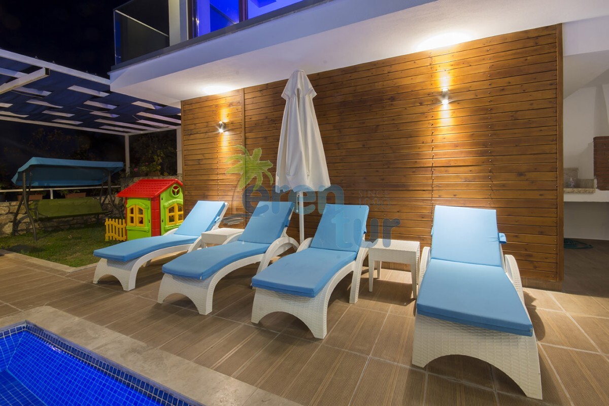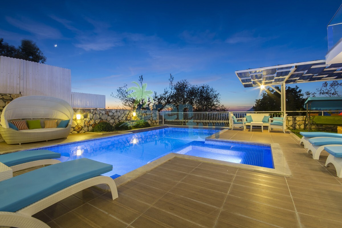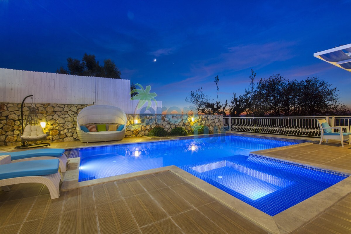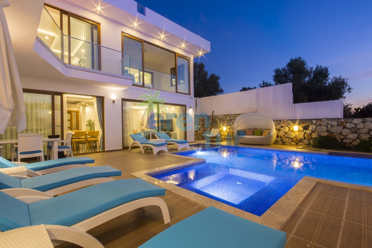 Kalkan Üzümlü köyünde bulunan bu lüks muhafazakar villa, 3 süit (banyolu) yatak odası ile 7 kişilik kapasiteye sahip bu zevkli ve modern bir şekilde dizayn edilmiş villamız’da, 2  ebeveyn odası , 1 adet te genç yatak odası mevcuttur . Yatak odalarının tümü özel banyoludur. 1.Katta bulunan ebeveyn yatak odasında jakuzi, çatı katında bulunan ebeveyn yatak odamızda ise cam çatı altında küçük bir özel havuz mevcuttur. Bu havuzun ebatları 6 mt x 2,50’dir, derinlik ise 1,20 cm’dir. Bu özel havuz kış aylarında ısıtma tertibatı sayesinde sizlere ısıtmalı  havuz seçeneği olacaktır. .Havuz ısıtma sistemiz maksimum 20 ile 28 derece arasında ısı sağlamaktadır. Isı derecesi hava şartlarına göre değişebilir . Villamızda küçük çocuklarınız içinde özel bir çocuk havuzu mevcuttur. Wifi mevcuttur.Villamızda ayrıca jakuzi ve bir sinema odası ve sauna mevcuttur . Villa içinde ihtiyacınız olan tüm mobilya mutfak araç gereçleri ütü saç kurutma makinesine kadar mevcuttur.