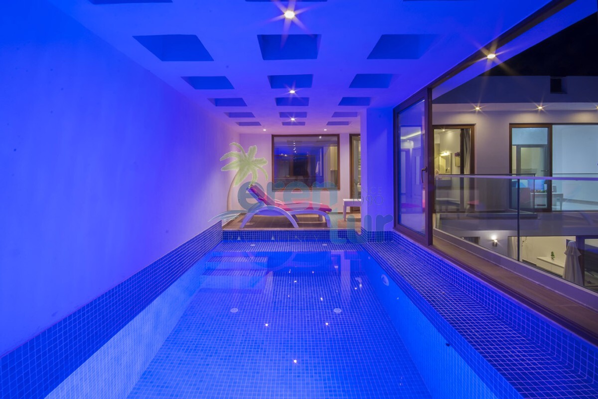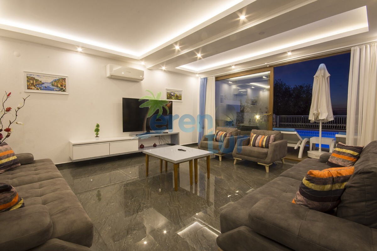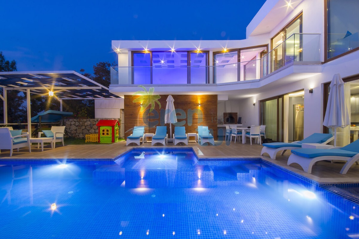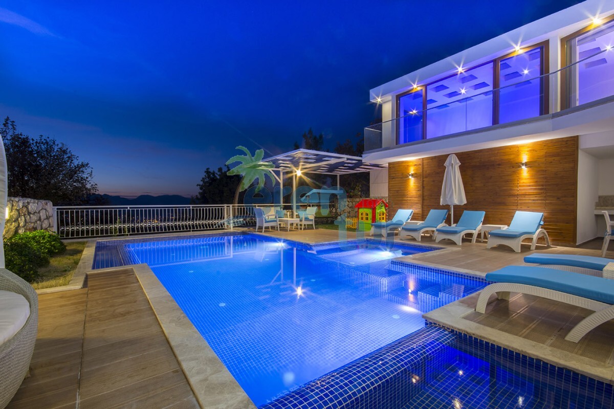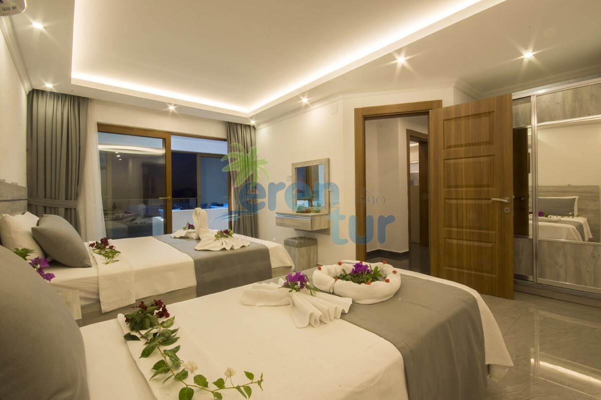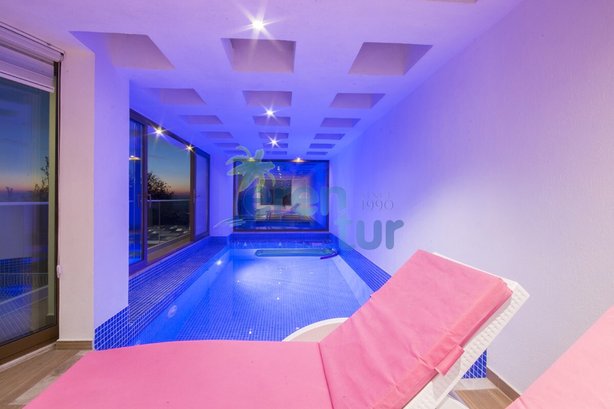Kalkan Üzümlü köyünde bulunan bu lüks muhafazakar villa, 3 süit (banyolu) yatak odası ile 7 kişilik kapasiteye sahip bu zevkli ve modern bir şekilde dizayn edilmiş villamız’da, 2  ebeveyn odası , 1 adet te genç yatak odası mevcuttur . Yatak odalarının tümü özel banyoludur. 1.Katta bulunan ebeveyn yatak odasında jakuzi, çatı katında bulunan ebeveyn yatak odamızda ise cam çatı altında küçük bir özel havuz mevcuttur. Bu havuzun ebatları 6 mt x 2,50’dir, derinlik ise 1,20 cm’dir. Bu özel havuz kış aylarında ısıtma tertibatı sayesinde sizlere ısıtmalı  havuz seçeneği olacaktır. .Havuz ısıtma sistemiz maksimum 20 ile 28 derece arasında ısı sağlamaktadır. Isı derecesi hava şartlarına göre değişebilir . Villamızda küçük çocuklarınız içinde özel bir çocuk havuzu mevcuttur. Wifi mevcuttur.Villamızda ayrıca jakuzi ve bir sinema odası ve sauna mevcuttur . Villa içinde ihtiyacınız olan tüm mobilya mutfak araç gereçleri ütü saç kurutma makinesine kadar mevcuttur.