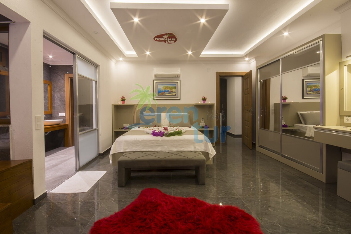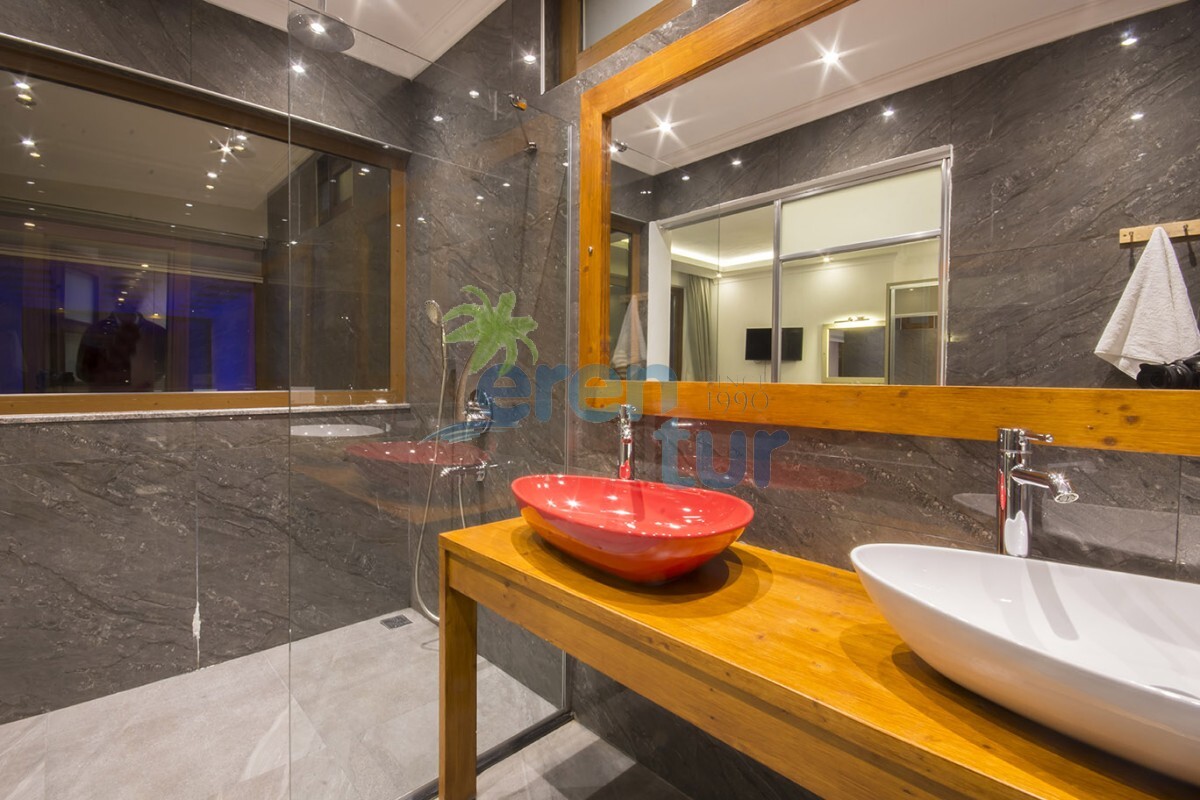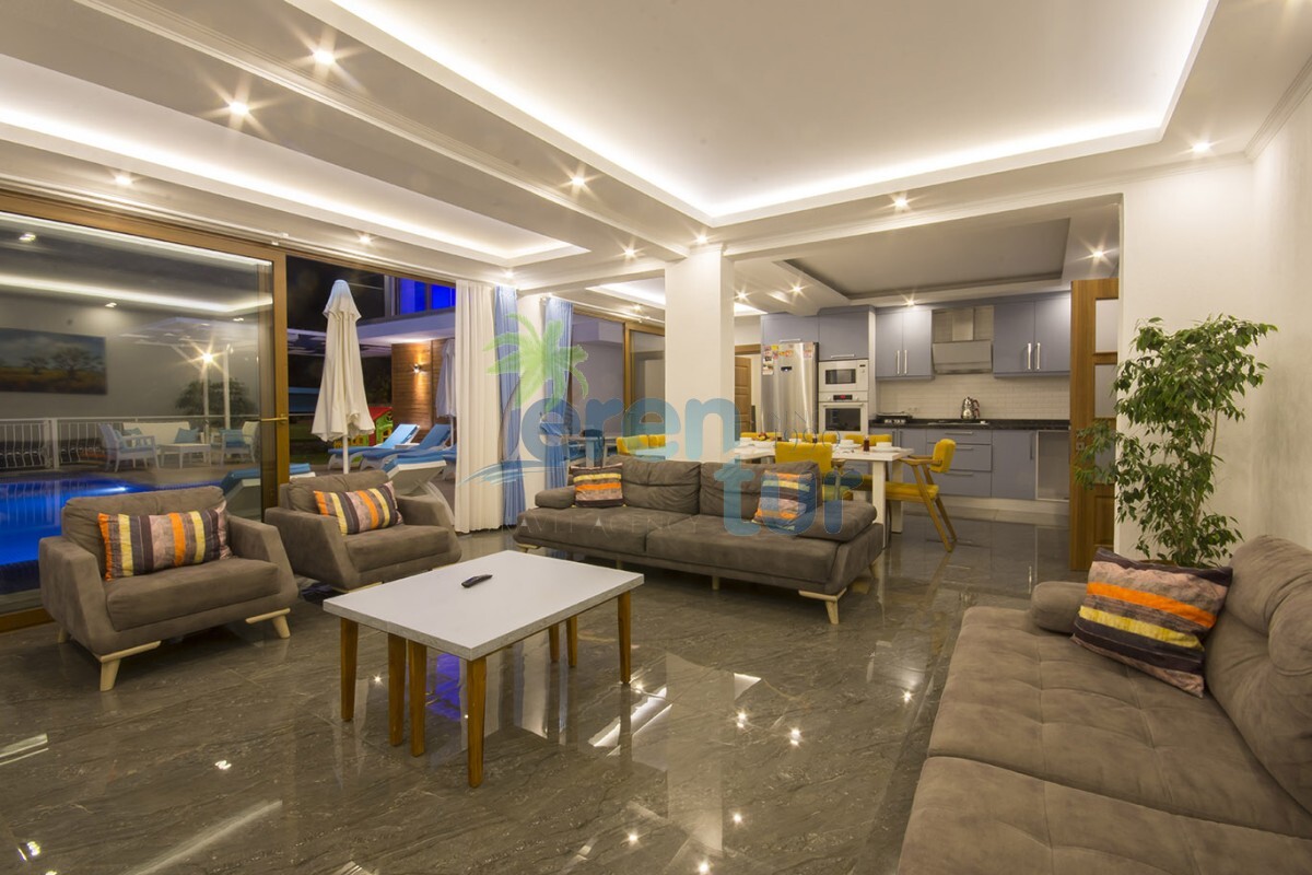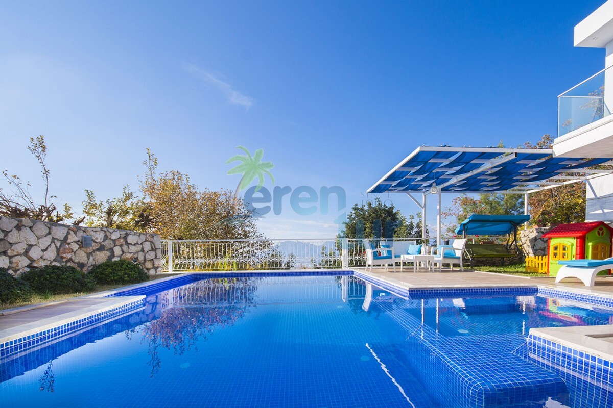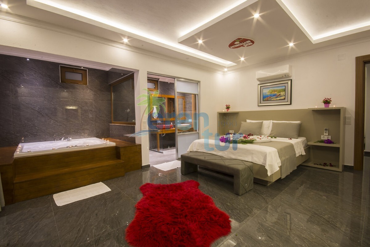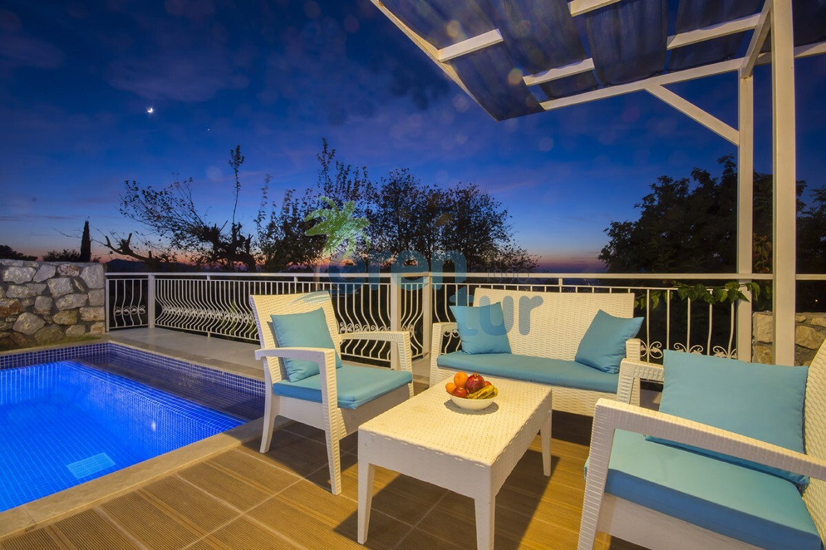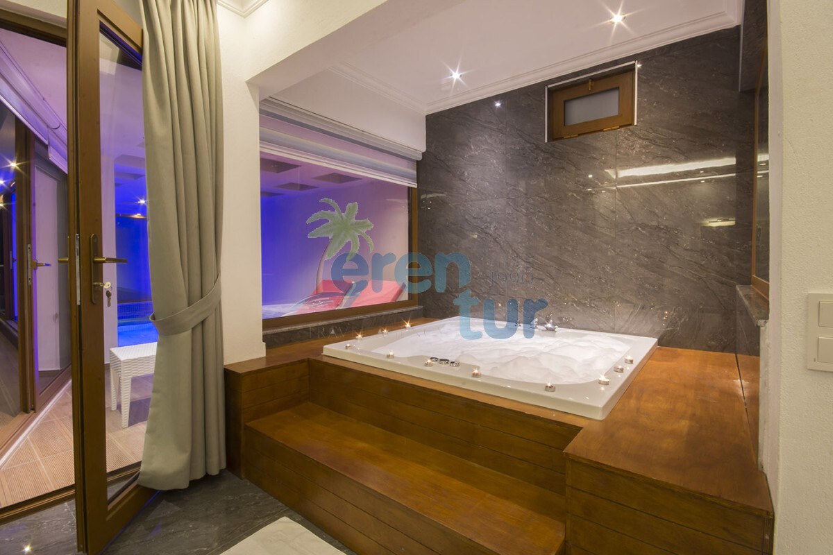 Kalkan Üzümlü köyünde bulunan bu lüks muhafazakar villa, 3 süit (banyolu) yatak odası ile 7 kişilik kapasiteye sahip bu zevkli ve modern bir şekilde dizayn edilmiş villamız’da, 2  ebeveyn odası , 1 adet te genç yatak odası mevcuttur . Yatak odalarının tümü özel banyoludur. 1.Katta bulunan ebeveyn yatak odasında jakuzi, çatı katında bulunan ebeveyn yatak odamızda ise cam çatı altında küçük bir özel havuz mevcuttur. Bu havuzun ebatları 6 mt x 2,50’dir, derinlik ise 1,20 cm’dir. Bu özel havuz kış aylarında ısıtma tertibatı sayesinde sizlere ısıtmalı  havuz seçeneği olacaktır. .Havuz ısıtma sistemiz maksimum 20 ile 28 derece arasında ısı sağlamaktadır. Isı derecesi hava şartlarına göre değişebilir . Villamızda küçük çocuklarınız içinde özel bir çocuk havuzu mevcuttur. Wifi mevcuttur.Villamızda ayrıca jakuzi ve bir sinema odası ve sauna mevcuttur . Villa içinde ihtiyacınız olan tüm mobilya mutfak araç gereçleri ütü saç kurutma makinesine kadar mevcuttur.