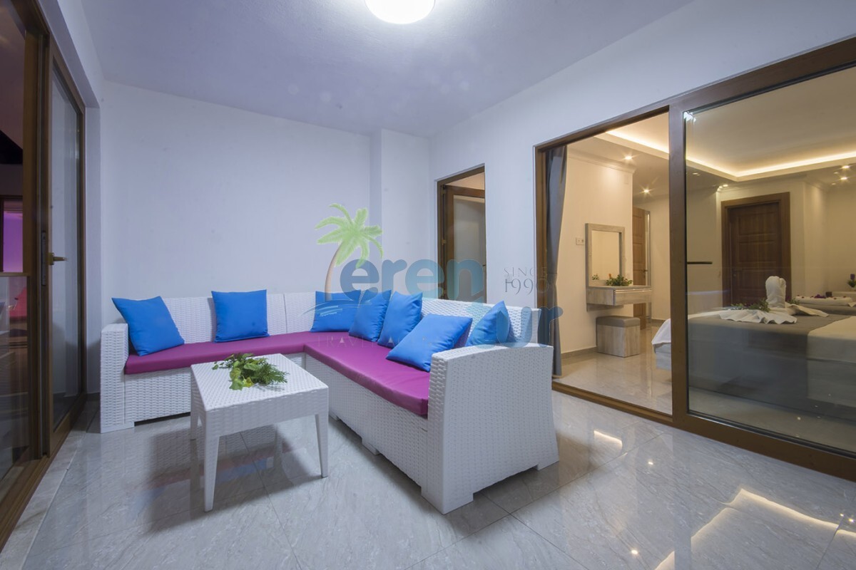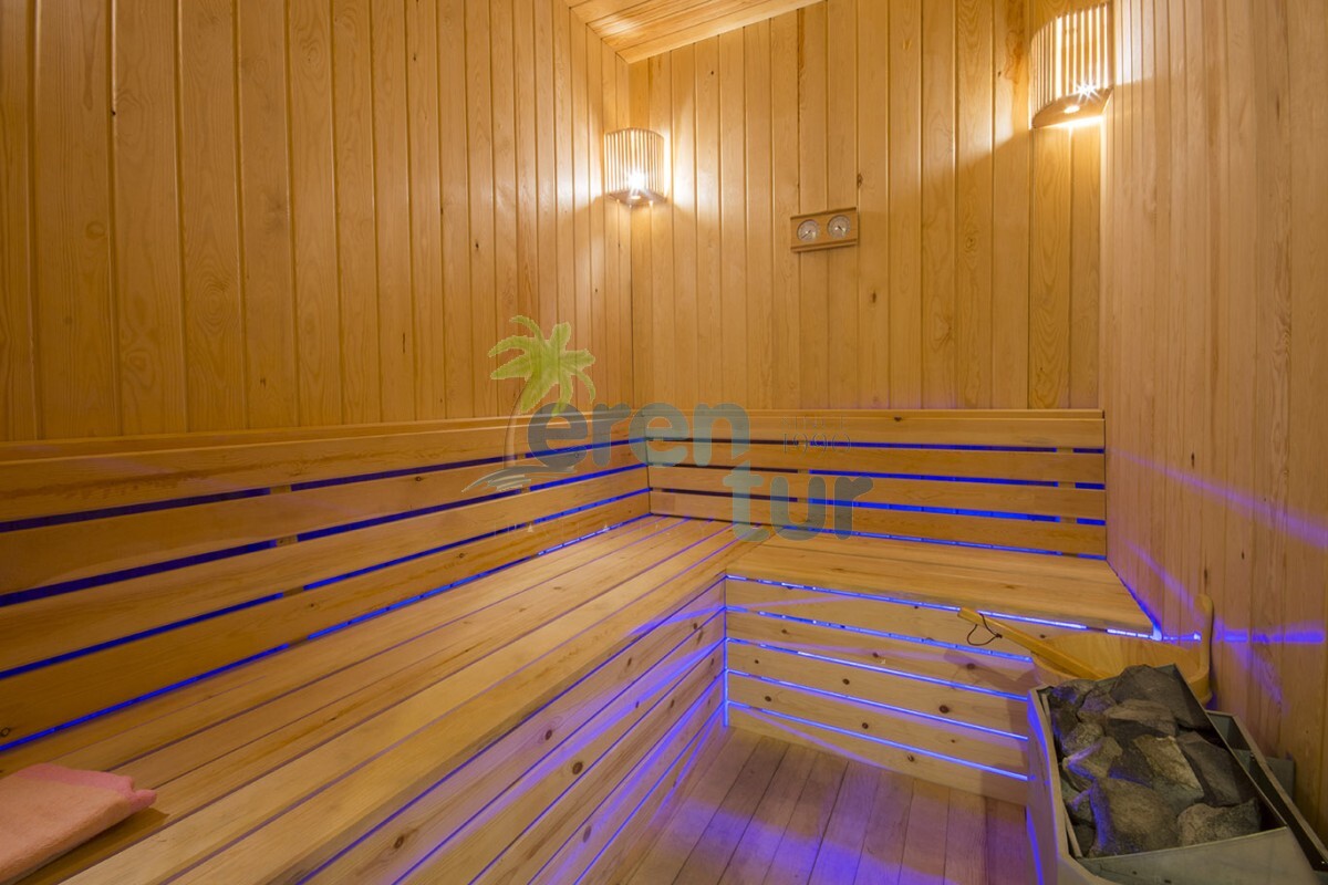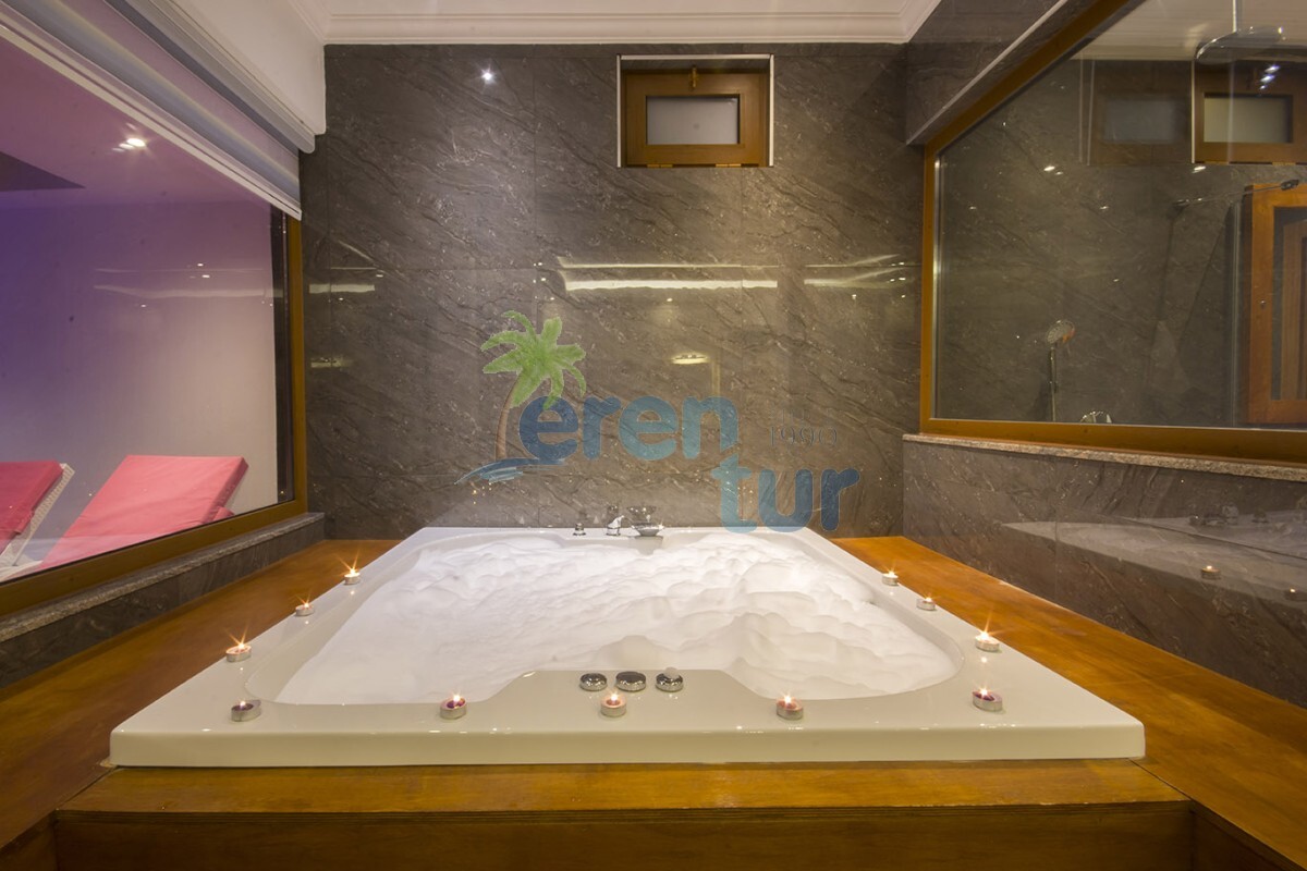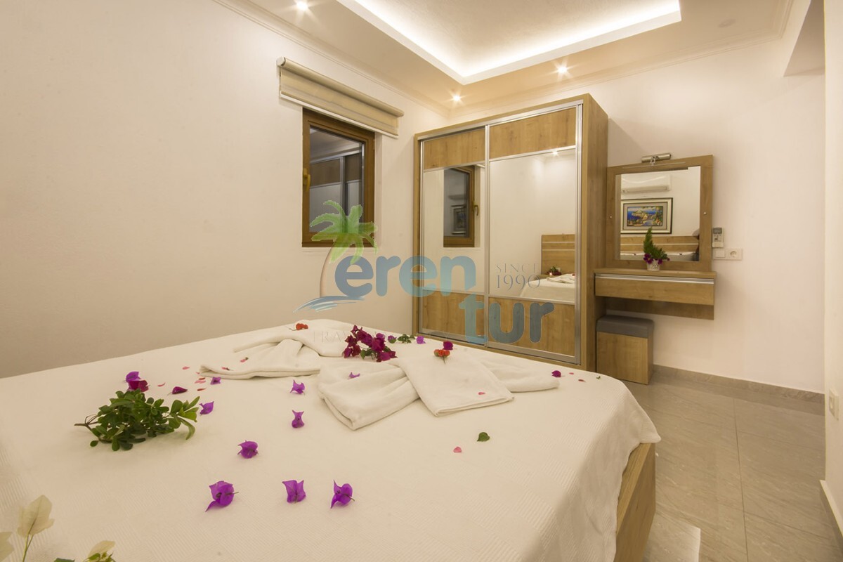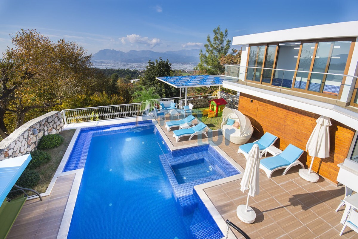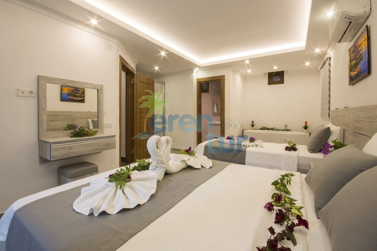 Kalkan Üzümlü köyünde bulunan bu lüks muhafazakar villa, 3 süit (banyolu) yatak odası ile 7 kişilik kapasiteye sahip bu zevkli ve modern bir şekilde dizayn edilmiş villamız’da, 2  ebeveyn odası , 1 adet te genç yatak odası mevcuttur . Yatak odalarının tümü özel banyoludur. 1.Katta bulunan ebeveyn yatak odasında jakuzi, çatı katında bulunan ebeveyn yatak odamızda ise cam çatı altında küçük bir özel havuz mevcuttur. Bu havuzun ebatları 6 mt x 2,50’dir, derinlik ise 1,20 cm’dir. Bu özel havuz kış aylarında ısıtma tertibatı sayesinde sizlere ısıtmalı  havuz seçeneği olacaktır. .Havuz ısıtma sistemiz maksimum 20 ile 28 derece arasında ısı sağlamaktadır. Isı derecesi hava şartlarına göre değişebilir . Villamızda küçük çocuklarınız içinde özel bir çocuk havuzu mevcuttur. Wifi mevcuttur.Villamızda ayrıca jakuzi ve bir sinema odası ve sauna mevcuttur . Villa içinde ihtiyacınız olan tüm mobilya mutfak araç gereçleri ütü saç kurutma makinesine kadar mevcuttur.